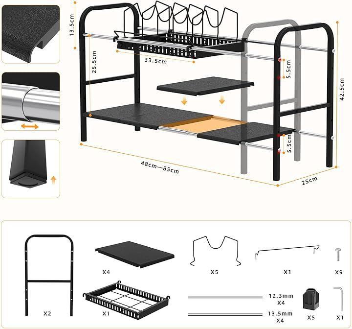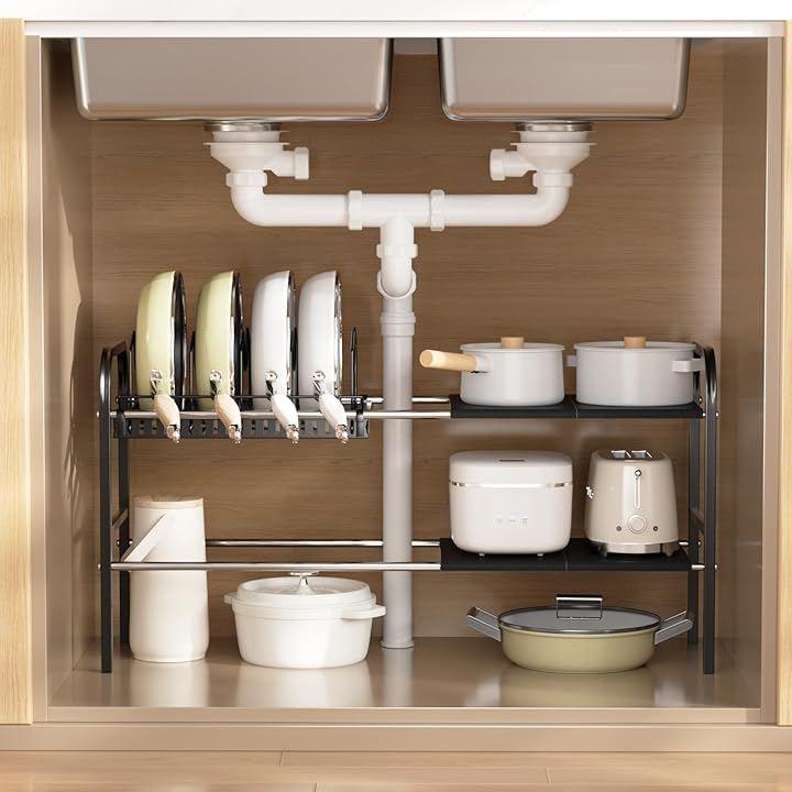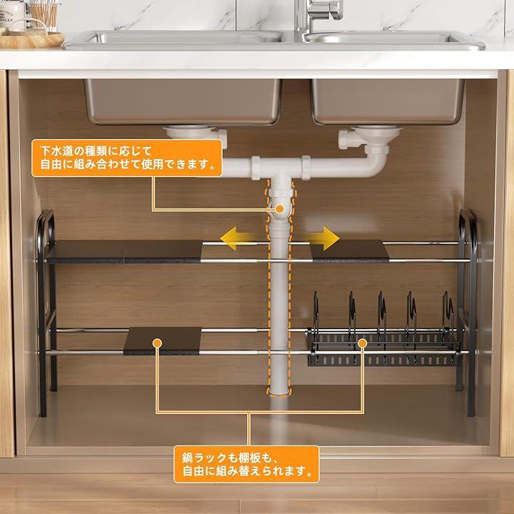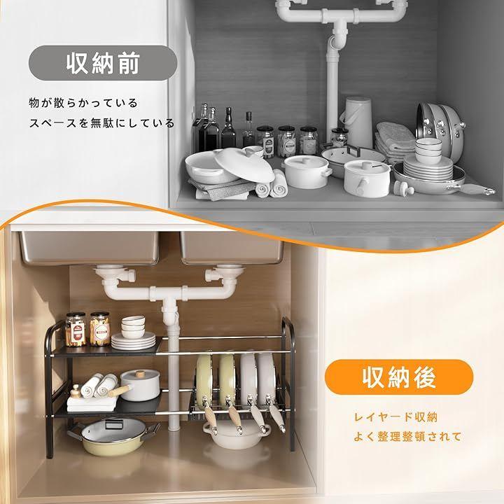 「伸縮式シンク下ラック」シンク下のデッドスペースを有効活用。幅48~85cmまで自在に伸縮可能で、様々なキッチンサイズにフィット。