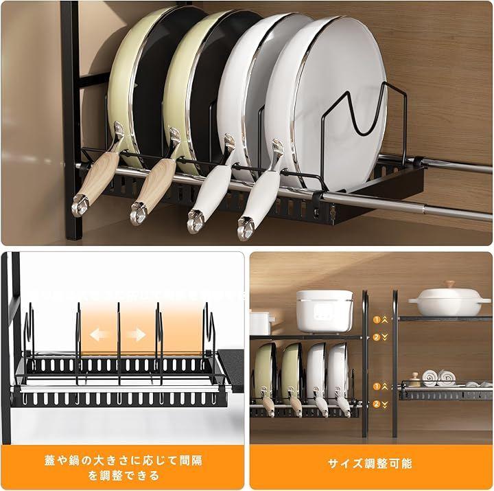 4つ棚+1個の仕切り可動の鍋ラック設計されており、たっぷり収納しながらすっきり整理できます。