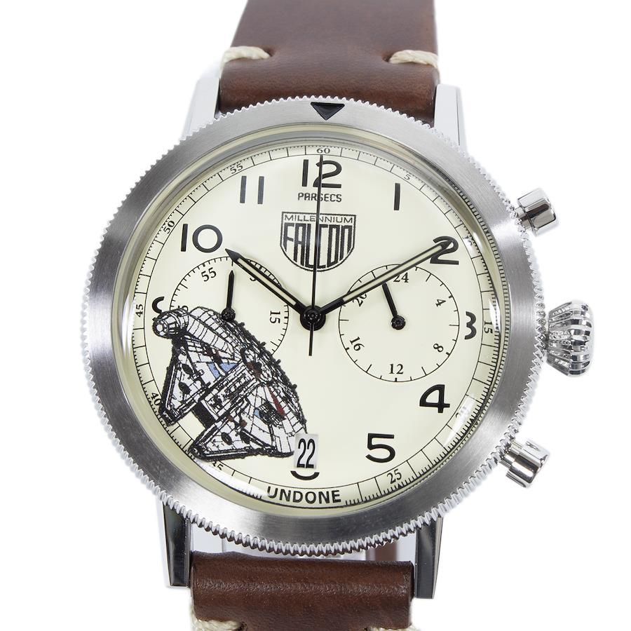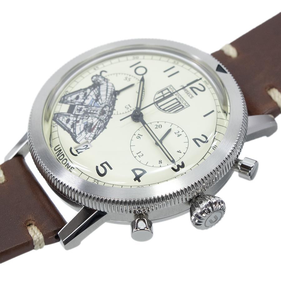 クリームイエローの文字盤には、伝説的な宇宙船「ミレニアムファルコン」が精緻に描かれました。