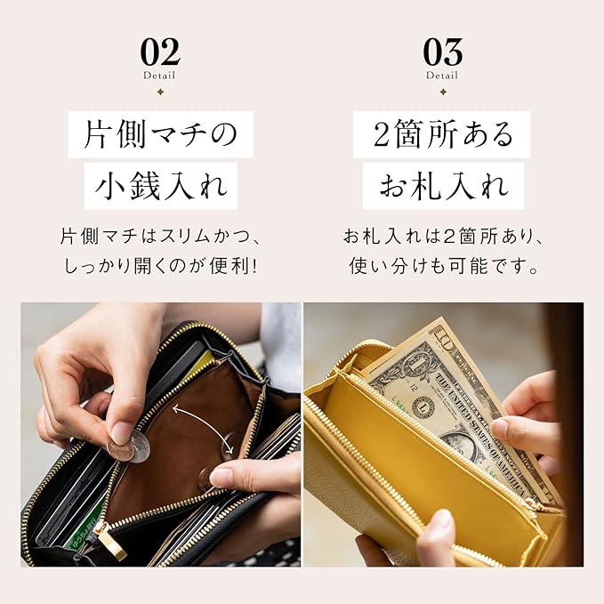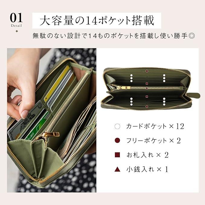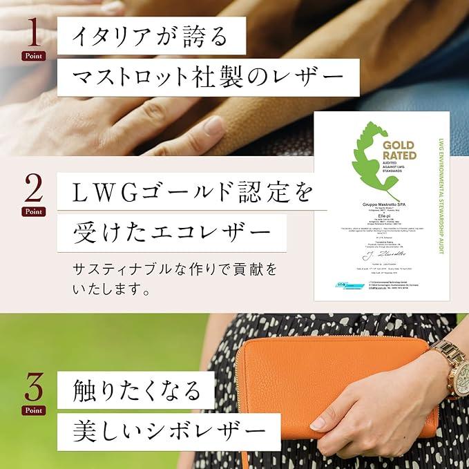 ■商品説明【 こだわりの本革使用。イタリアンレザー長財布 】イタリアが誇るマストロット社のイタリアンレザーを使用。職人たちが手間暇かけた上質で上品なイタリアンレザーです。手触り優しく、美しいシボレザーで耐久性も抜群。内側はゴートレザー(ヤギ革)を使用しているので、柔らかく傷がつきにくいカードの取り出しにぴったりなイタリアンレザー長財布です。【 環境に優しい!認定されたエコレザー 】有名ブランドも使用するイタリアンレザーは、LWGゴールド認証の環境や人に配慮して生産されたエコレザーでもあります。サスティナブルな時代にベストなエコレザー長財布です。また、人気のラウンドファナーを使用し、シンプルなデザインが上品さを演出します。【 大容量のカードポケット/マチ付きの小銭入れ 】カードは大容量の12枚収納が可能。免許証・保険証・マイナンバーカード・クレジットカード・キャッシュカード・ICカードなど、キャッシュレス化が進む中でも嬉しい大容量カードケースです。小銭入れは片マチを採用。スリムさをキープしつつしっかり開くのが使いやすいポイントです。【 2箇所あるお札入れ/マルチ収納可能なフリーポケット 】お札入れは2箇所に分かれているので、お好みで仕分けが可能。大きく開き見やすいのも◎使い方いろいろなフリーポケットは、こちらも2箇所ありレシート・領収書・切符・チケット等マルチ収納ができる便利な収納です。【 お財布を守る!RFIDスキミング防止機能付き 】クレジットカードなどの個人情報の入った磁気情報を盗み取られるスキミング被害に必要なのはRFIDスキミング防止機能。本製品はスキミング防止フィルムをカードケース全体に搭載し、カードの大切な情報を守るイタリアンレザー長財布です。【 サイズ 】横幅×縦幅×マチ:約20cmx10cmx2.5cm / 重量:約193g【 収納 】カードポケット×12 / ロングポケット×2 / 札入れ×2 / 小銭入れ×1【 素材 / 留め具 】外装:イタリアンレザー(牛革) / 内装:ゴートレザー(ヤギ革) / 留め具:ファスナー(ジッパー)【 カラー 】グリーン / オレンジ / イエロー / ブラック / ブルー