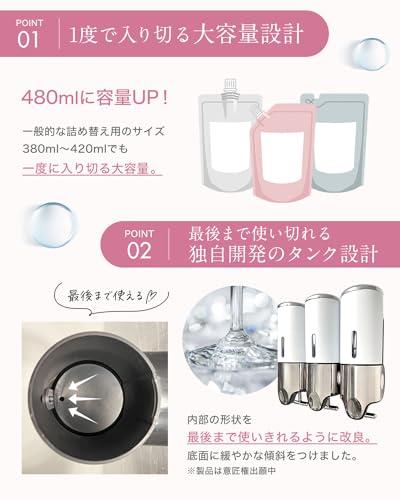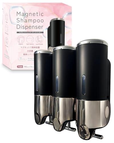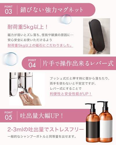 ??【日本企業独自開発】当店独自の形状により、バスルームを"スッキリ彩る"シャンプーディスペンサー ??【錆びない強力マグネット】様々な磁石工場との交渉の末、シャンプーディスペンサーに適した磁石工場にサビない磁石を生産していただくことで、理想の製品が完成しました。 ??【480mlの大容量ボトル】一般的な詰め替え用パックが入りきる大容量!1度に入れきることができるので、ストレスなくお使いいただけます。 ??【最後まで使い切れる独自設計】ボトルの底に傾斜を付けることで、液体を最後までお使いいただけるよう従来製品を改良いたしました。※ボトル底の傾斜は当店独自の設計です。 ??【液体を注ぎやすい大きな設計】間口が7cmの広々とした設計なので、壁掛けのままでも簡単に液体を入れることができます。 ??【片手で使えるレバー方式】プッシュ式の類似製品では、ズレ落ちたりするので両手で支えながら使わないといけませんが、レバー方式にすることによって片手でも簡単に操作出来るように改良いたしました。 ??【レバー1回で"ちょうど良い"吐出量】1回で2-3mlの大吐出量にグレードアップ!"shampoo"や"body soap"、"conditioner"など用途によってレバーを引く回数を調整してお使いください。