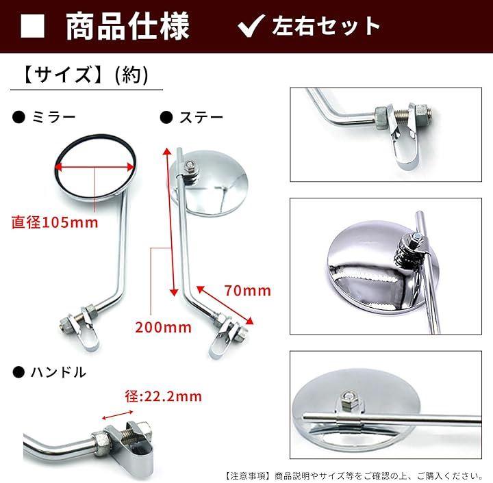 「商品仕様」左右セット「サイズ」ミラー直径:105mm / ステー:200mmx70mm / ハンドル径:22.2mm(約)