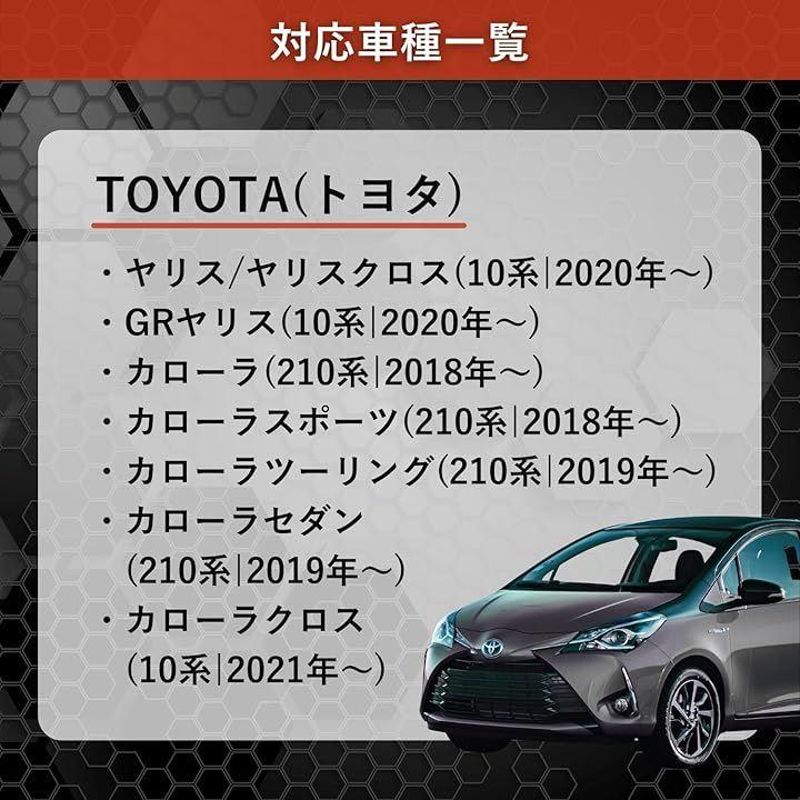 「対応車種」 *トヨタ ・ヤリス / ヤリスクロス(10系|2020年~) ・GRヤリス(10系|2020年~) ・カローラ(210系|2018年~) ・カローラスポーツ(210系|2018年~) ・カローラツーリング(210系|2019年~) ・カローラセダン(210系|2019年~) ・カローラクロス(10系|2021年~) *年式・グレードにより形状が異なる場合があります。