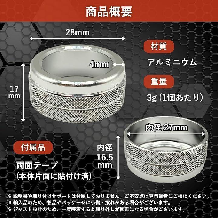 「仕様」 サイズ:外径(28mmx28mmx17mm)、内径(27mmx27mmx16.5mm) 重さ:3g(1個あたり) 材質:アルミニウム