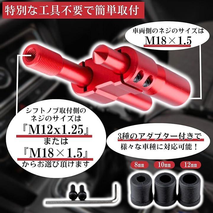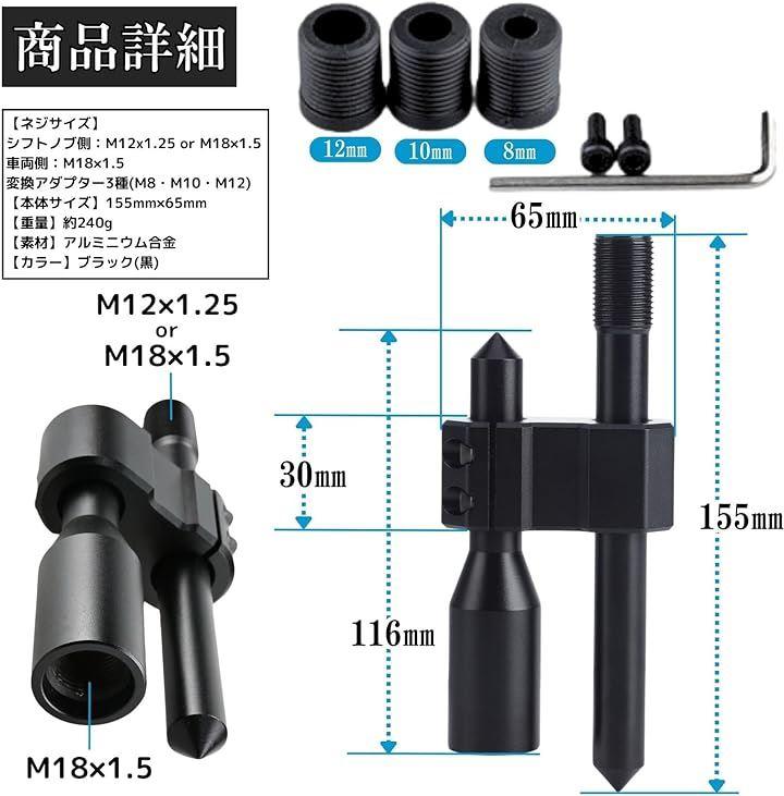 「ネジサイズ」シフトノブ側:M12x1.25 or M18x1.5、車両側:M18x1.5 変換アダプター3種(M8・M10・M12)付 「本体サイズ」155mmx65mm 「重量」約240g 「素材」アルミニウム合金 「カラー」ブラック(黒) or レッド(赤)