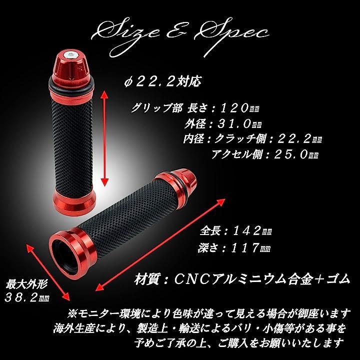 「サイズ」汎用グリップφ22.2対応全長:142mm握り部分外径:31mm握り部長さ:120mm内径クラッチ側:22.2mmアクセル側:25mm深さ:117mm最大外形:38.2mm