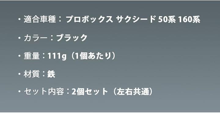 適合車種:プロボックス サクシード 50系 160系 カラー:ブラック 重量:111g(1個あたり) 材質:鉄 セット内容:2個セット(左右共通)