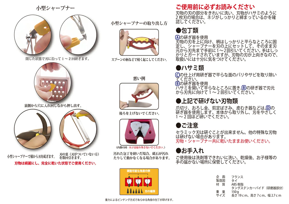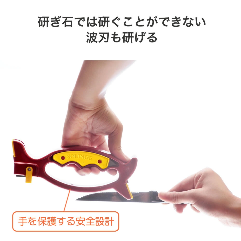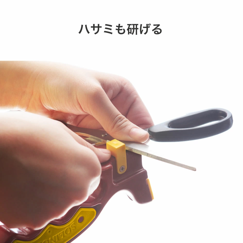 【商品情報】4種類の研ぎ器として使える!仕上げ用/ハサミ用/包丁・ナイフ用/ナイフ・ハサミ以外の刃物用国内累計販売数 45万個突破!研ぎ石では研ぐことができない 波刃も研げる手を保護する安全設計!小型シャープナー付き!
