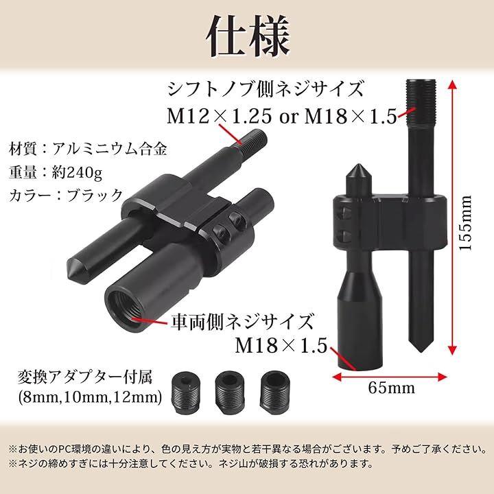 「シフトノブ取付ネジサイズ」M12x1.25 or M18x1.5 「サイズ」155mmx65mm 「重量」約240g 「材質」アルミニウム合金 「カラー」黒/ブラック *ネジの締めすぎには十分注意してください。
