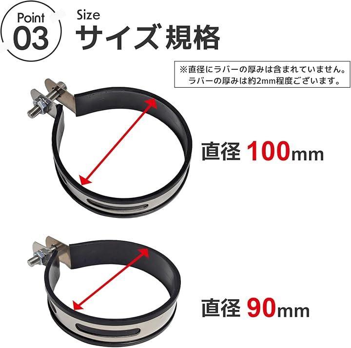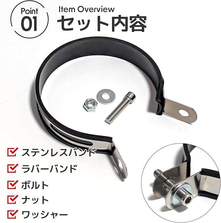 「セット内容」ステンレスバンド、保護用ラバーバンド、ボルト、ワッシャー、ナット。