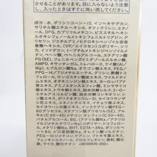 成分:水、ポリシリコーンー15, イソヘキサデカン、 サリチル酸エチルヘキシル、オクトクリレン、エタノール、DPG、カプリリルメチコン、ビスエチルヘキシルオキシフェノールメトキシフェニルトリアジン、グリセリン、ジエチルアミノヒドロキシベンゾイル安息香酸ヘキシル、(VP/エイコセン)コポリマー、シリカ、イソドデカン、t-ブチルメトキシジベンゾイルメタン、ベヘン酸、ベヘニルアルコール、ステアリン酸 PG (SE), フェニルベンズイミダゾールスルホン酸、 AMPD, キサンタンガム、トレハロース、ケイ酸(AI/Mg), ヒアルロン酸Na、オウゴン根エキス、PEG/PPG-14/7ジメチルエーテル、グリシン、酢酸トコフェロール、マンゴスチン樹皮エキス、ワイルドタイムエキス、オタネニンジン根エキス、ヨーロッパブナ芽エキス、アミノエタンスルフィン酸、ミシマサイコ根エキス、トウキ根エキス、加水分解シルク、2-0-エチルアスコルビン酸、加水分解コンキオリン、シソ葉エキス、ポリクオタニウム-51、セイヨウサンザシ花エキス、ユキノシタエキス、イチョウ葉エキス、 セイヨウハッカ葉エキス、イソステアリン酸PEG-60グリセリル、ステアリン酸グリセリル(SE)、アルキル (C30-45) メチコン、オレフィン (C30-45), バチルアルコール、BG、(アクリル酸Na/アクリロイルジメチルタウリンNa)コポリマー、トコフェロール、メタリン酸Na, BHT, EDTA-3Na、ポリソルベート80, ピロ亜硫酸Na、オレイン酸ソルビタン、 PEG-10ジメチコン、テアニン、フトモモ葉エキス、 フェノキシエタノール、クロルフェネシン、香料、酸化鉄、マイカ、酸化チタン