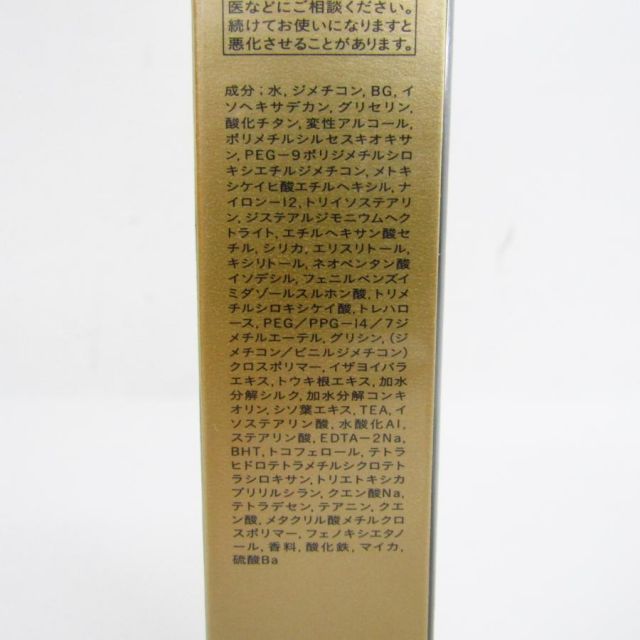 成分:水、ジメチコン、酸化チタン、ジフェニルシロキシフェニルトリメチコン、グリセリン、 DPG、メトキシケイヒ酸エチルヘキシル、BG, PEG-10ジメチコン、PEG-20、ラウリル PEG-9ポリジメチルシロキシエチルジメチコン、PEG-6, PEG-32, ジステアルジモニウムヘクトライト、(ジフェニルジメチコン/ビニルジフェニルジメチコン/シルセスキオキサン)クロスポリマー、(ジメチコン/ビニルジメチコン) クロスポリマー、水添ポリイソブテン、トレハロース、アルガニアスピノサ核油, PEG/PPG -14/7ジメチルエーテル、グリシン、トルメンチラ根エキス、 トリメチルシロキシケイ酸、イザヨイバラエキス、トウキ根エキス、加水分解シルク、加水分解コンキオリン、シソ葉エキス、 ベヘン酸、リンゴ酸ジイソステアリル、セスキイソステアリン酸ソルビタン、水酸化Al、(ジメチコン/フェニルビニルジメチコン)クロスポリマー、トリエトキシカプリリルシラン、 EDTA-3Na、ステアリン酸、 テトラヒドロテトラメチルシクロテトラシロキサン、トリエトキシシリルエチルポリジメチルシロキシエチルジメチコン、 テトラデセン、BHT、シリカ、テアニン、トコフェロール、タルク、 ポリメチルシルセスキオキサン、ハイドロゲンジメチコン、メチルパラベン、エチルパラベン、 香料、酸化鉄、硫酸Ba、合成金雲母、マイカ