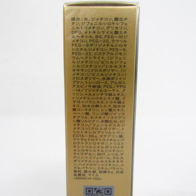 成分:水、ジメチコン、BG、イソヘキサデカン、グリセリン、 酸化チタン、変性アルコール、 ポリメチルシルセスキオキサン、PEG-9ポリジメチルシロキシエチルジメチコン、メトキシケイヒ酸エチルヘキシル、ナイロン-12、トリイソステアリン、ジステアルジモニウムヘクトライト、エチルヘキサン酸セチル、シリカ、エリスリトール、 キシリトール、ネオペンタン酸イソデシル、フェニルベンズイミダゾールスルホン酸、トリメチルシロキシケイ酸、トレハロース、PEG/PPG-14/7ジメチルエーテル、グリシン、(ジメチコン/ビニルジメチコン) クロスポリマー、イザヨイバラエキス、トウキ根エキス、加水分解シルク、加水分解コンキオリン、シソ葉エキス、TEA、イソステアリン酸、水酸化AI. ステアリン酸、EDTA-2Na, BHT、トコフェロール、テトラヒドロテトラメチルシクロテトラシロキサン、トリエトキシカプリリルシラン、クエン酸Na, テトラデセン、テアニン、クエン酸、メタクリル酸メチルクロスポリマー、フェノキシエタノール、香料、酸化鉄、マイカ、 硫酸Ba