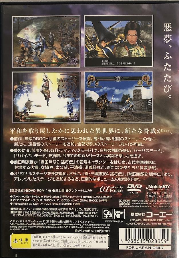商品紹介●魔王が創り出した異世界んじ新たな驚異の影が。前作のその後に迫る続編がついに登場突如現れた魔王・遠呂智(オロチ)によって創り出された異次元の世界を舞台に「真・三國無双」シリーズと「戦国無双」シリーズの武将になりかわり、一騎当千の爽快アクションが味わえるタクティカルアクションゲーム。●前作「無双OROCHI」後のストーリー本作で描かれるのは、前作「無双OROCHI」のその後の世界。三國・戦国の英傑達の活躍により平和を取り戻したかに思われた異世界に、新たな脅威が迫ろうとしていた。前作同様、三国志の魏・呉・蜀と戦国の4本のストーリーを収録。さらに、それら4本とは異なる新たなストーリーも追加しています。●時空を越えて新たな英傑たちが参戦本作ならではの夢の英傑が登場。古代中国神話に登場する「伏犠」をはじめ、時空を越えた新たな英傑たちが多数追加されています。また、2007年8月に発売された「戦国無双2猛将伝」に登場した「前田利家」や「長宗我部元親」などの5人の武将も参戦しています。●夢の競演を実現する新モード。夢の対決・