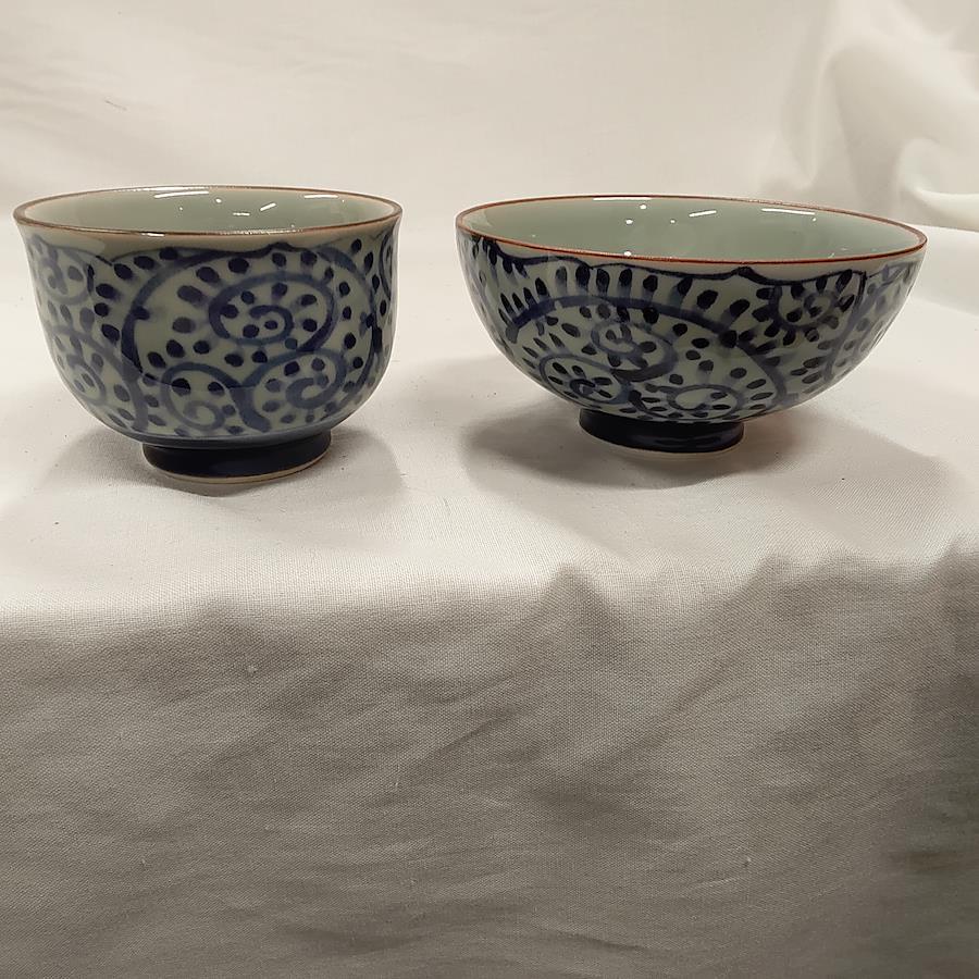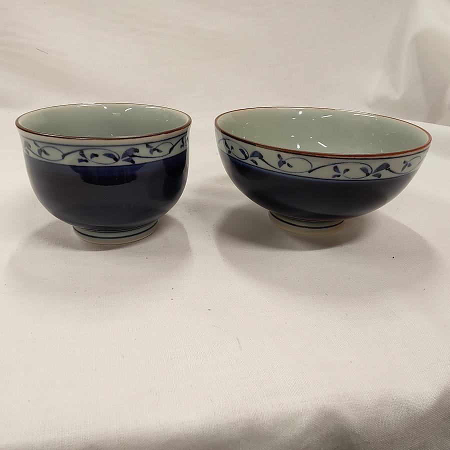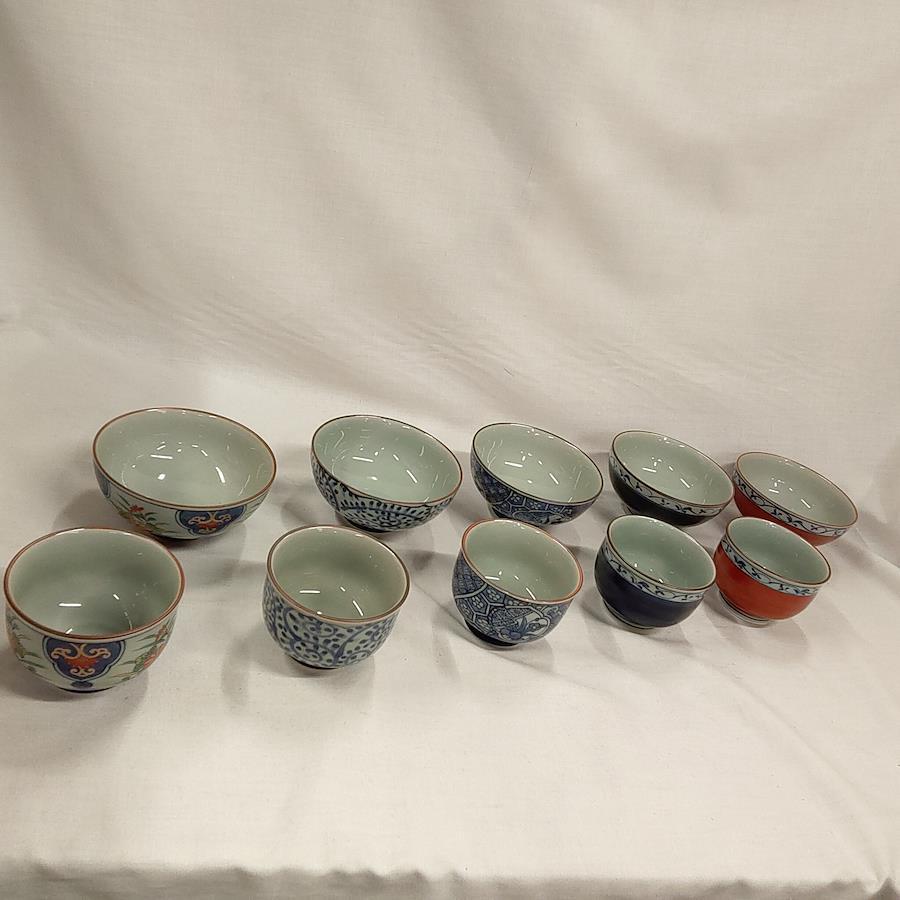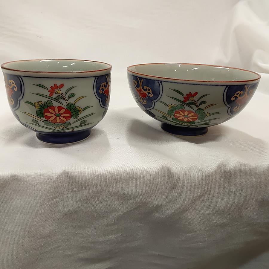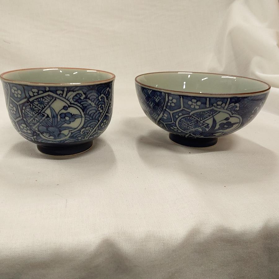 未使用 有田焼 仁彩作 湯呑み 茶碗 x5セット染付(藍色)と色絵(赤や緑)が組み合わされたデザインが特徴です。