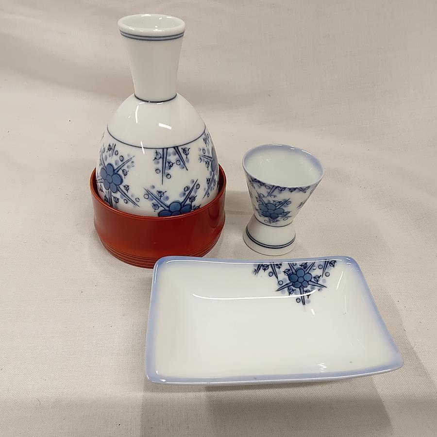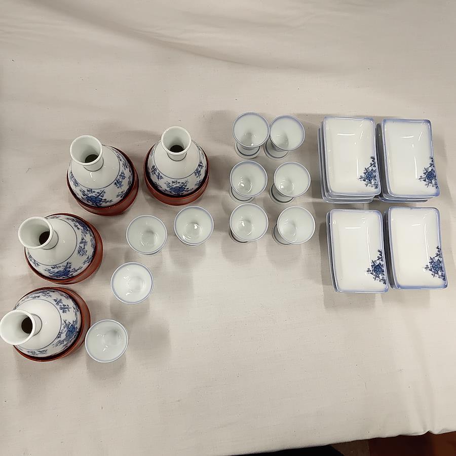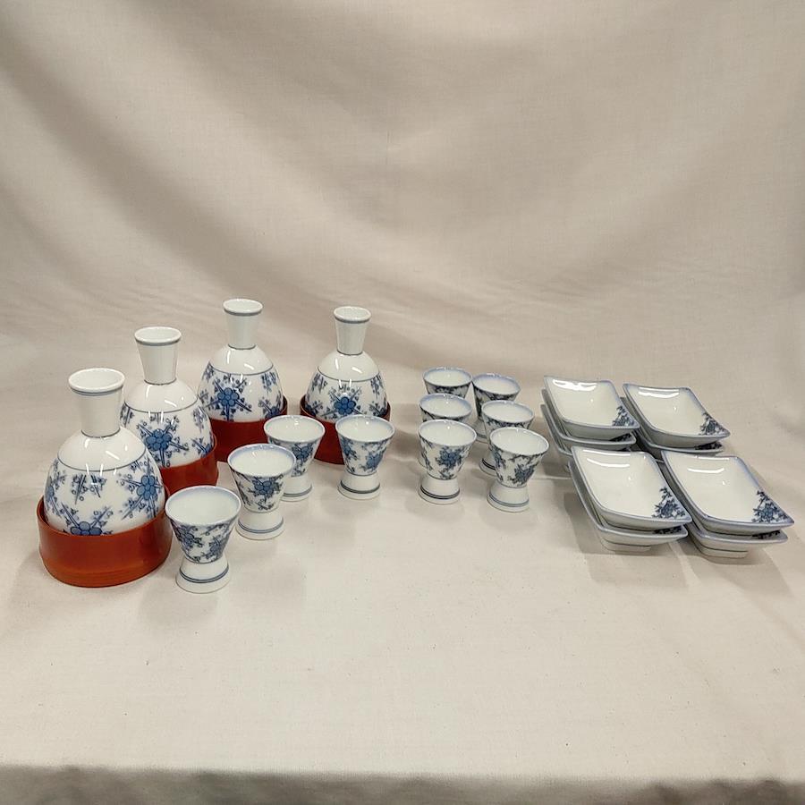 未使用 有田焼 鶴松 徳利X4 受け皿X4 お猪口X10 醤油皿X10 です。徳利の受け皿のみプラスチック製です。裏面には鶴松の銘あり(お猪口以外)長期保管により経年劣化しているかもしれません。軽くチェックしましたが傷もなく美品です。外箱のみ汚れ等、経年劣化しています。(写真参照)