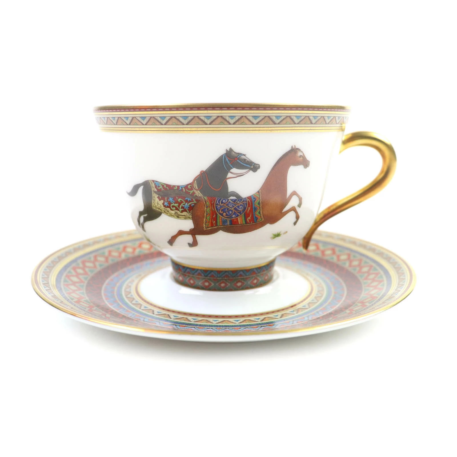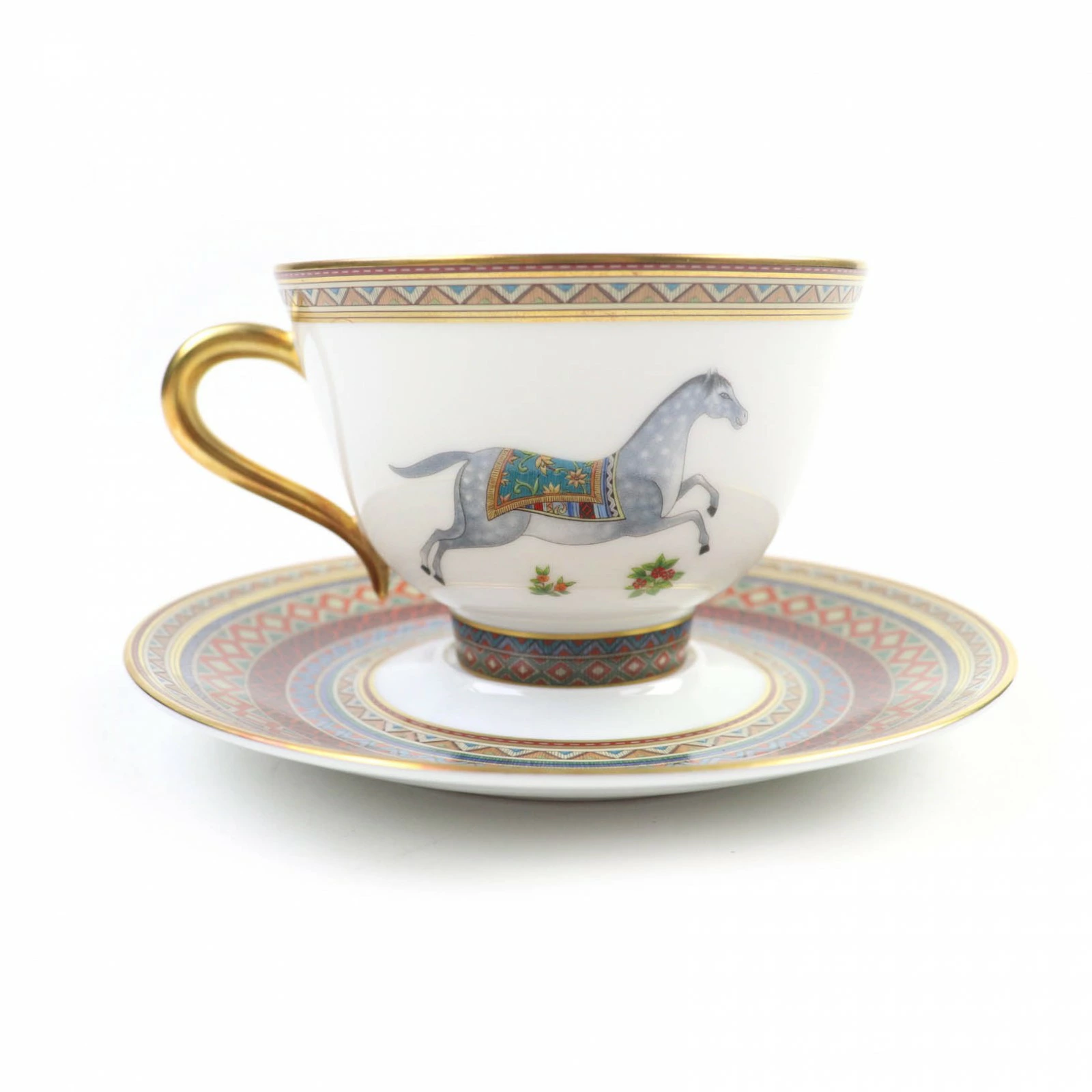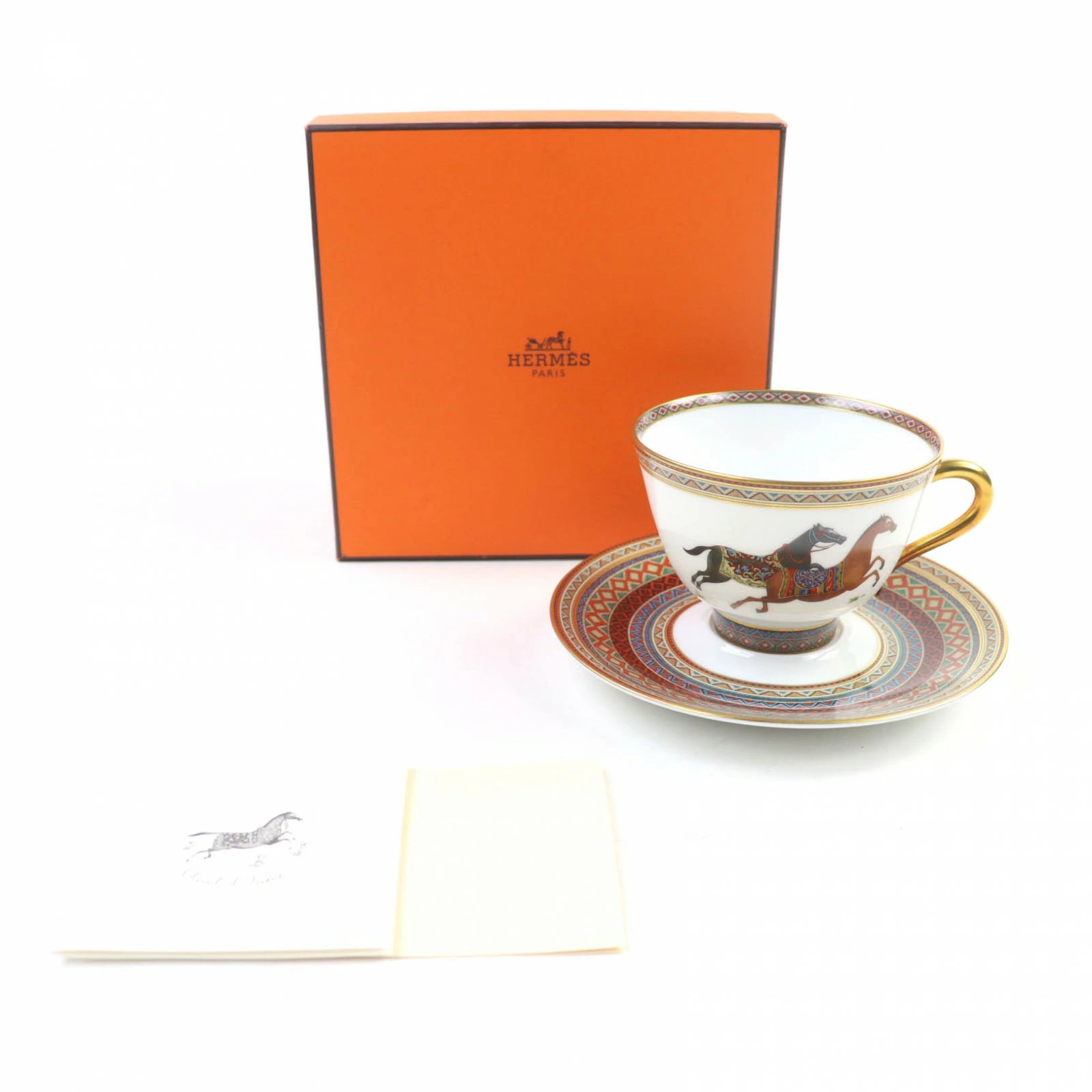 Unused HERMES Chevaldrien ceramic horse motif teacup and saucer set, multi-purpose, with box, for women. [Pre-owned]