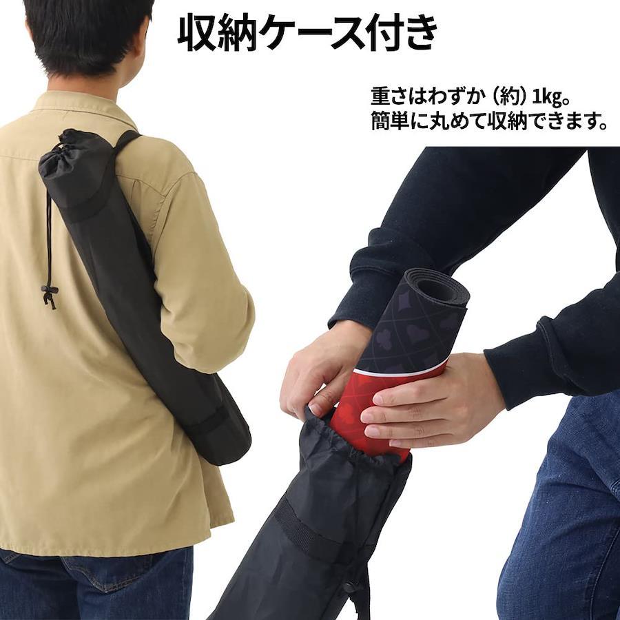 【本格的なカジノ空間を】 お家やお店で手軽にポーカーゲームを楽しめるポーカーマットです。【高品質マット】 表面はマウスパッドような素材でできており、カードは滑らかに滑りストレスなくゲームを楽しめます。 やんわり沈み込む弾力のある素材で、カードはめくりやすく、チップも取扱いやすいデザインです。【収納ケース付き】 重さはわずか(約)1kg。 簡単に丸めて収納できるので、準備も片付けもしやすいです。 長さ調整ができるので、肩にかけて持ち運びもできます。【商品詳細】 商品名:ポーカーマット120×60 サイズ(約):120×60cm 厚さ(約):0.2cm 重量(約):1kg【免責事項】メーカーによる商品リニューアルに伴いパッケージが変更が行われた場合、新パッケージでお届け致します事ご了承願います。