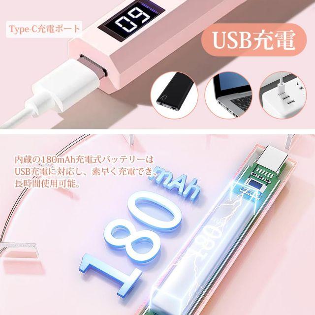 3.【充電式デザイン】内蔵された180mAhの充電式バッテリーはUSBケーブルで充電可能。フル充電で長時間使用でき、電池交換の手間を省き、どこでも簡単にネイルケアができます。