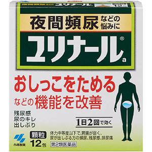 ■商品概要メーカー:小林製薬商品名:ユリナールa 12包医薬品分類:第2類医薬品区分:OTC医薬品小児用区分:大人用(大人(15歳以上)の用量・用法しかない)薬剤形状:散剤・顆粒・粉末内容量:12包商品概要:●9種類の生薬からなる清心蓮子飲(せいしんれんしいん)という漢方製剤●膀胱機能を改善し、おしっこをためられるようにして、頻尿などを改善していきます●飲みやすい顆粒タイプのお薬です●続けやすい1日2回の用法に変更【使用期限】出荷時点で使用期限終了まで1年以上JANコード:4987072030202商品コード:075647485