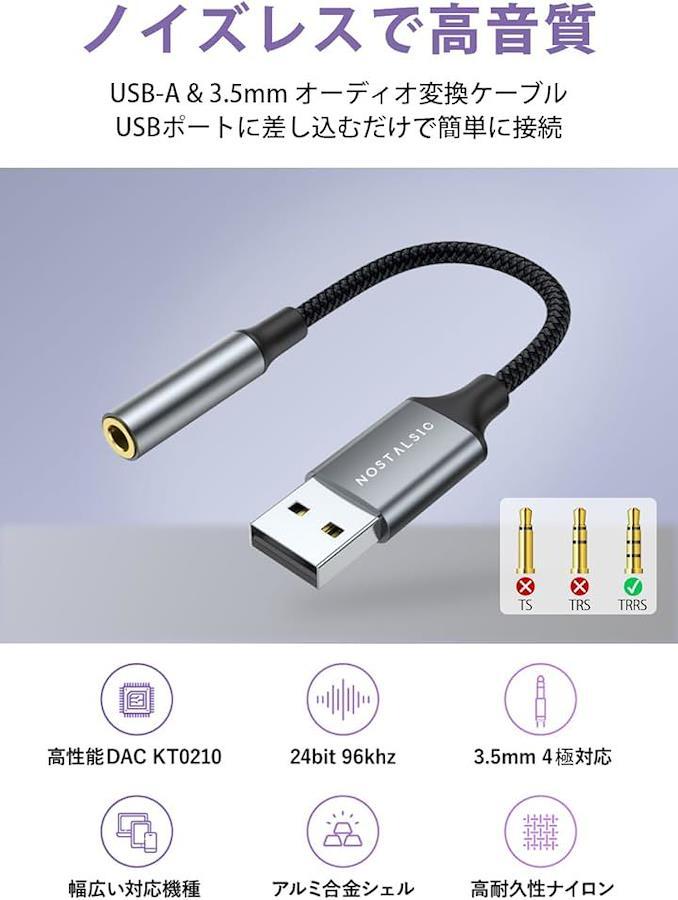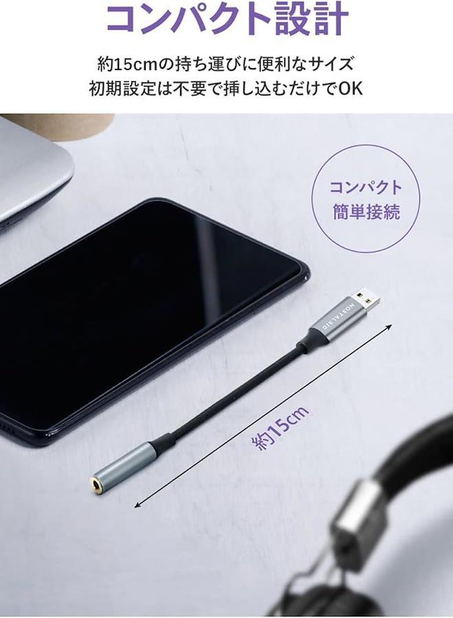 「USBオーディオ変換アダプター」USBポートを3.5mm TRRS(4極)ミニジャックに変換するオーディオアダプターです。