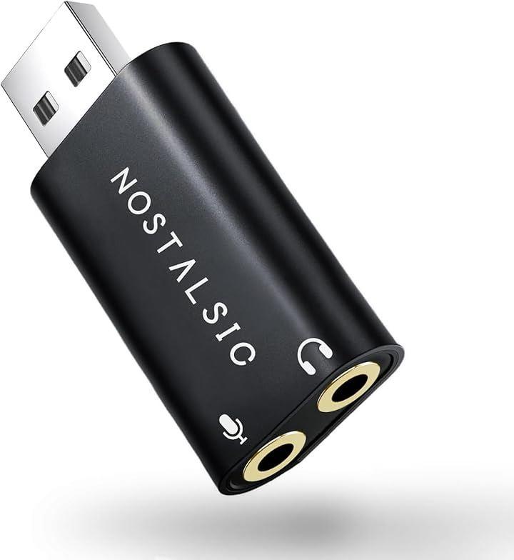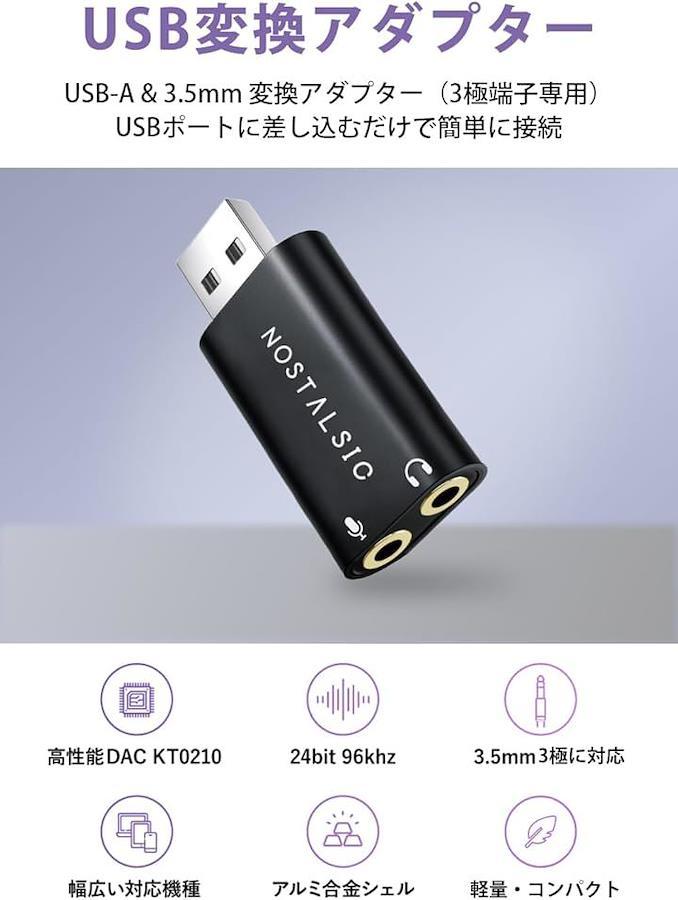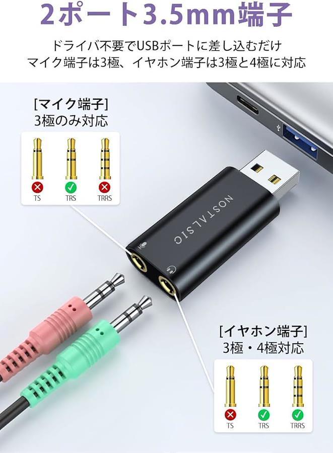「USBオーディオ変換アダプター」3.5mmプラグのヘッドホン、スピーカー等の音声出力やマイク入力をUSBポートに変換するオーディオ変換アダプタです。