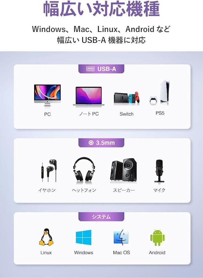 「幅広い互換性」Windows、Mac OS、PS4、PS5、Linux、Chromebookなど、USB-Aポートを備えたさまざまなデバイスで利用可能。