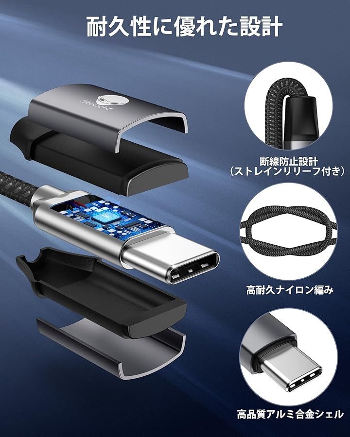 さらに、ケーブル部分は断線に強く絡みにくいナイロン編み仕様で、5000回以上の屈曲テストにも合格。