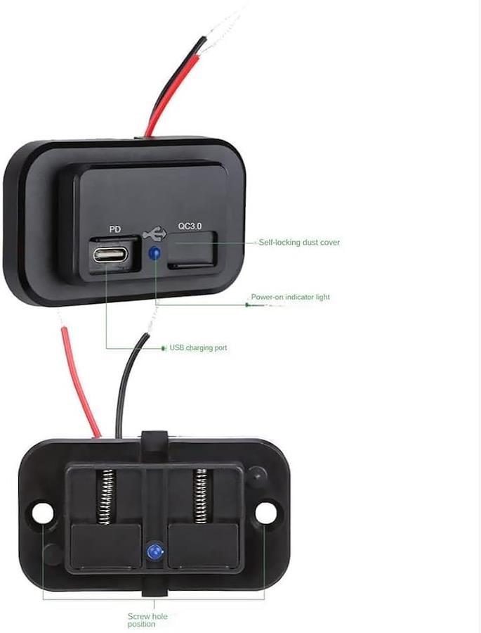 この充電器ソケットは、12Vおよび24V対応で、キャンピングカーやトラック、RVなどの多様な車両に取り付け可能です。
