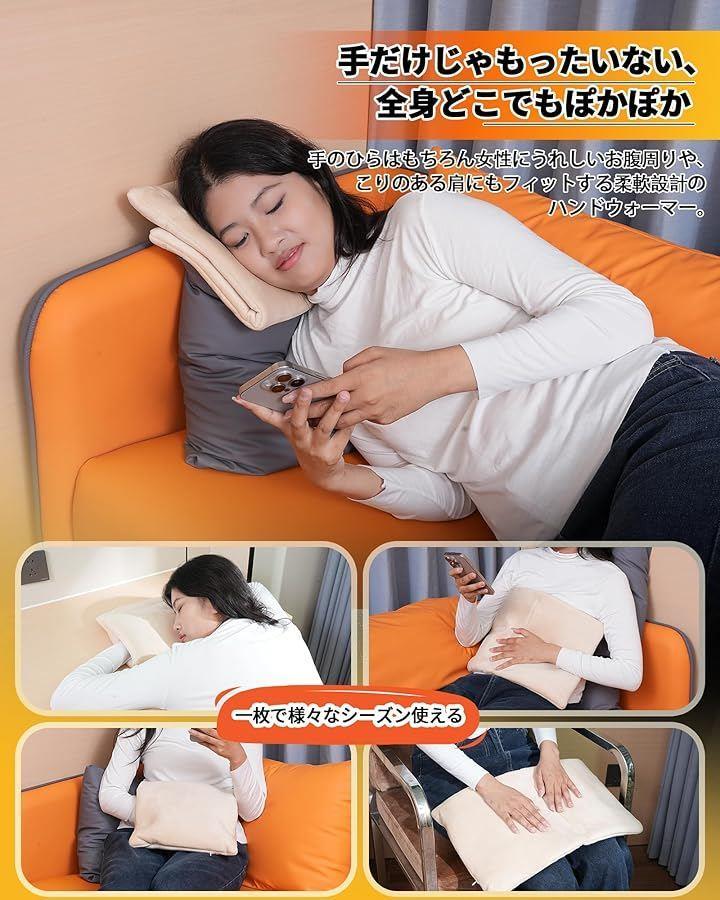 「一台二役&2秒速暖。冷える体を瞬時に温める」手を入れればハンドウォーマーとして、またファスナーを開けばホットマットとして使える優れものです。