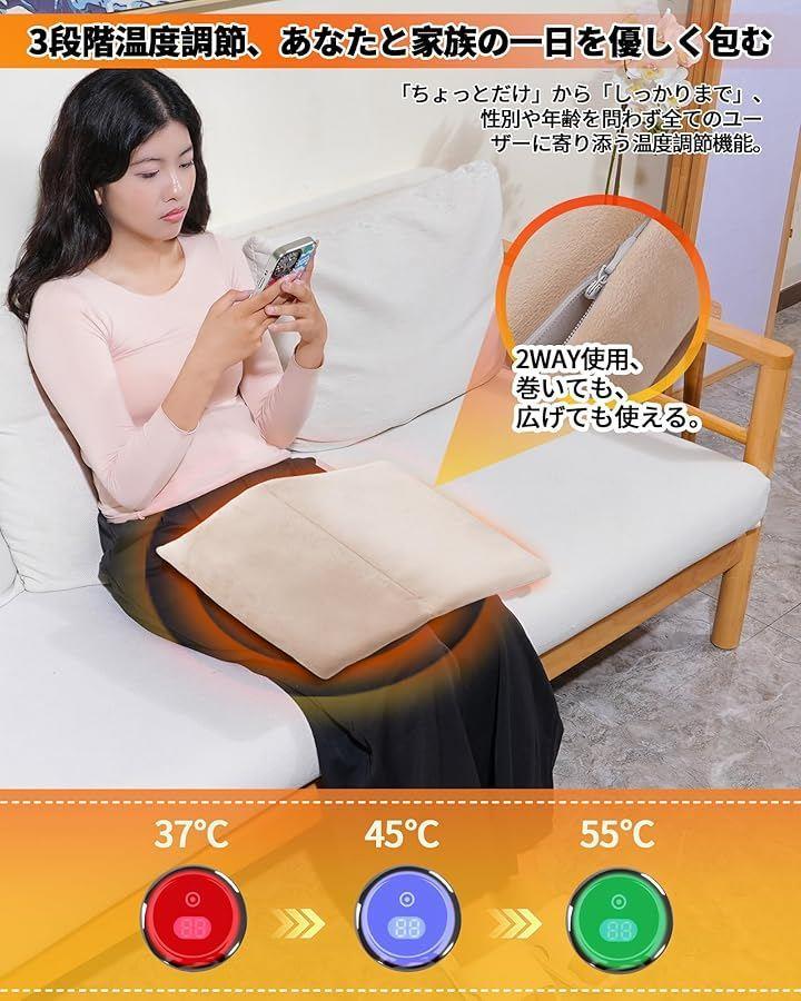 「3段階温度調整&USB Type-C給電」ホットマットは低温/中温/高温(45℃-55℃-65℃)の三段階で細かく温度調整ができ、好みに合わせた最適な暖かさで快適に過ごせます。