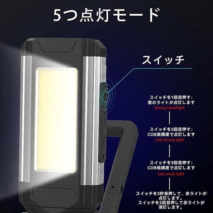 「モード切替で全シーン対応」ワンタッチで用途に応じた照明を即時切替:(1)強力LEDスポット(懐中電灯モード)(2)COB広角強光(3)COB省エネモード(4)緊急赤点灯(5)赤点滅警告灯。