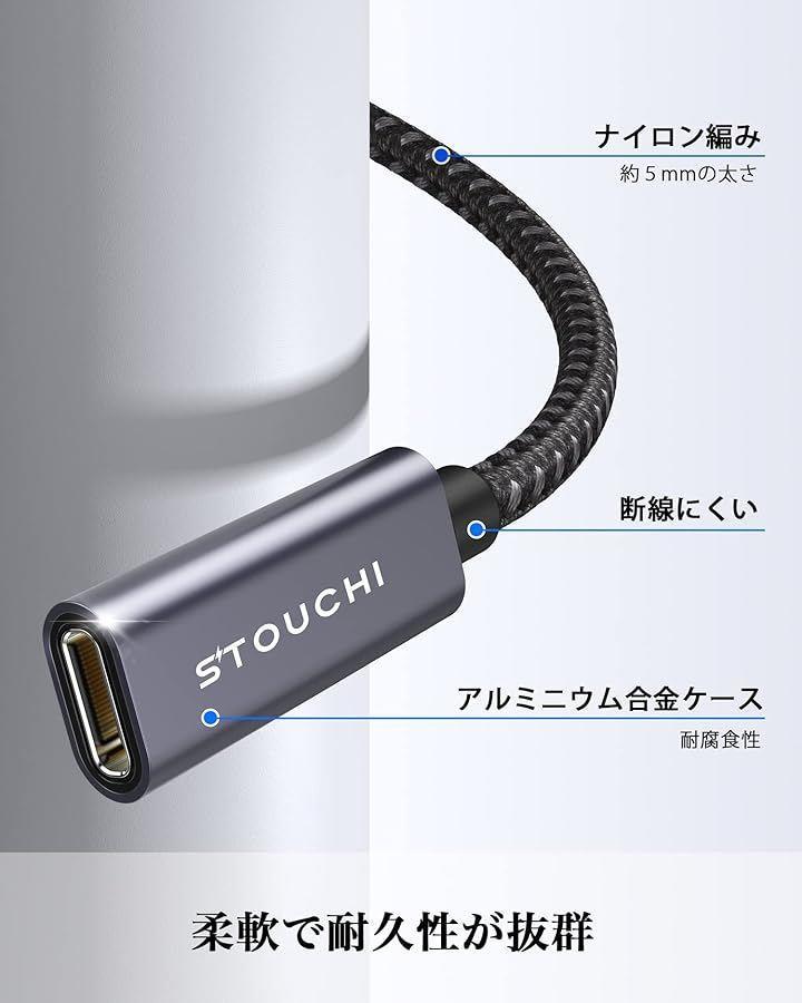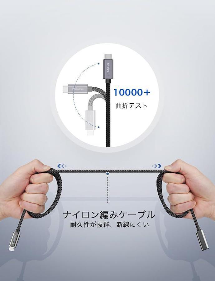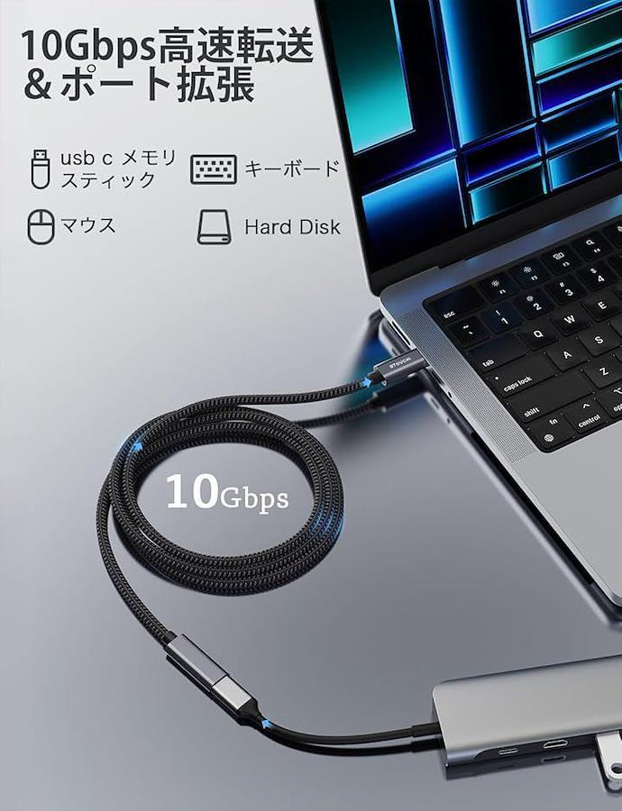 「高性能USB-C延長ケーブル・1本で多用途」USB 3.2 Gen2規格に準拠し、最大10Gbpsの高速データ転送、4K@60Hz映像出力、さらに最大100W(20V/5A)PD急速充電に対応。