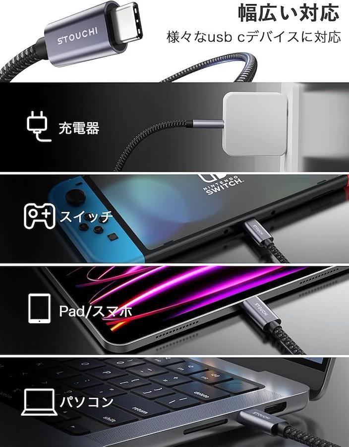 「幅広い互換性・多デバイス対応」MacBook Pro/Air、iPad Pro/mini、WindowsノートPC、スマートフォン(Galaxy/Pixel/Xperiaなど)、Nintendo Switch、Steam Deck、PSVR2などUSB-C搭載機器に幅広く対応。