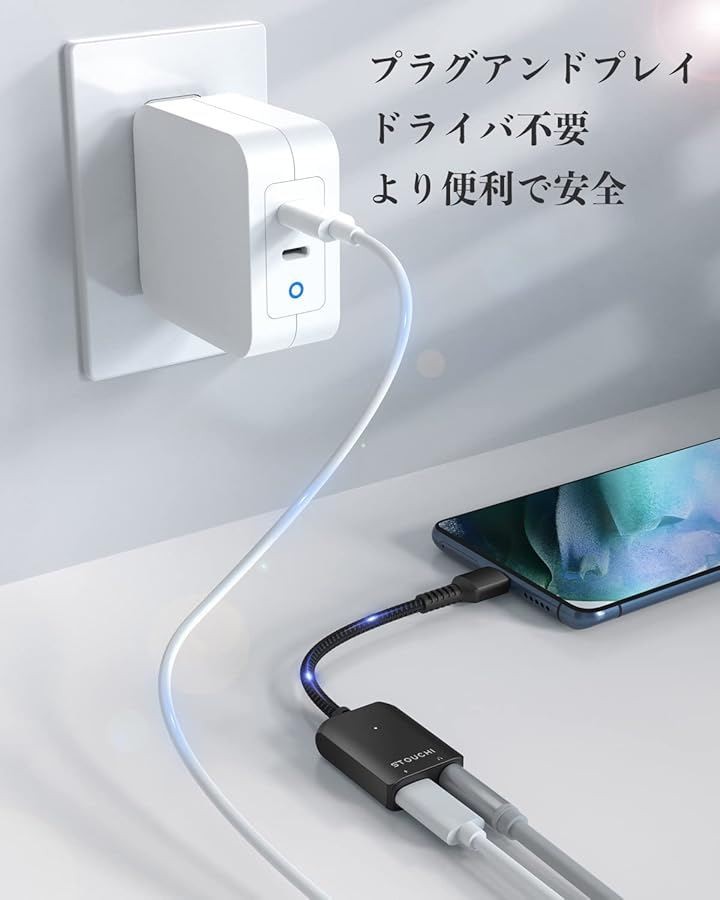 スマホやパソコンやタブレットに挿入して、イヤホンで音楽鑑賞やビデオ視聴やゲームをしながら急速充電できます。