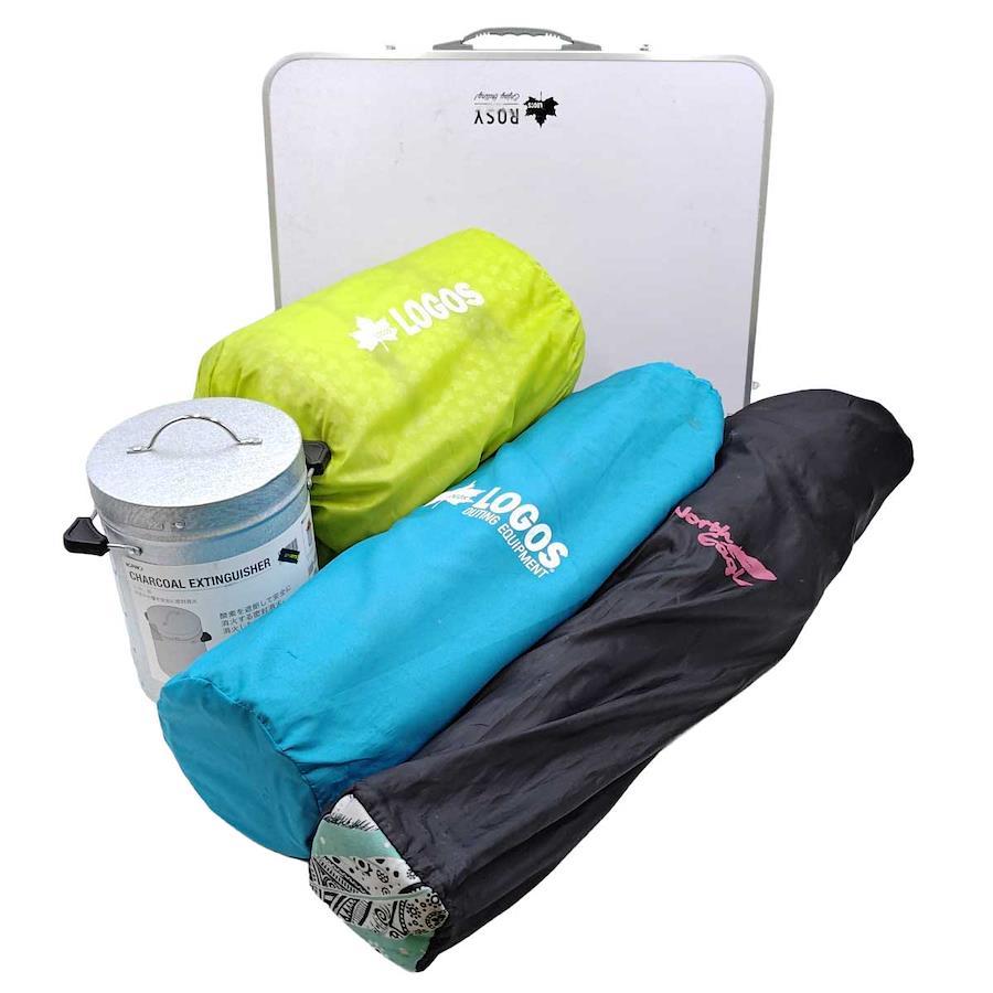 [タイプ] ロゴス 2FD テーブル 9060N 73180012 / インフレートマット シングル / 丸洗い寝袋フィールダー 2 72600630 / North Eagle チェア / イグニオ 火消し器[状態] いずれも使用感があり、汚れや傷みなどがみられます。テーブルは延長の足が欠品しています。