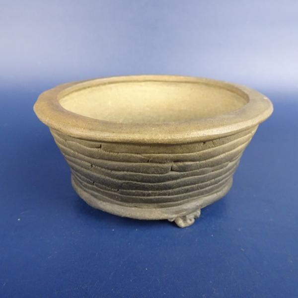 Used bonsai pot by Shimizu Toshishige, small, approximately 9.5cm long, round, with a 'kumo-ashi' (un-foot) outer rim, yakishime (yaki-shime) finish, clay finish, in original condition.