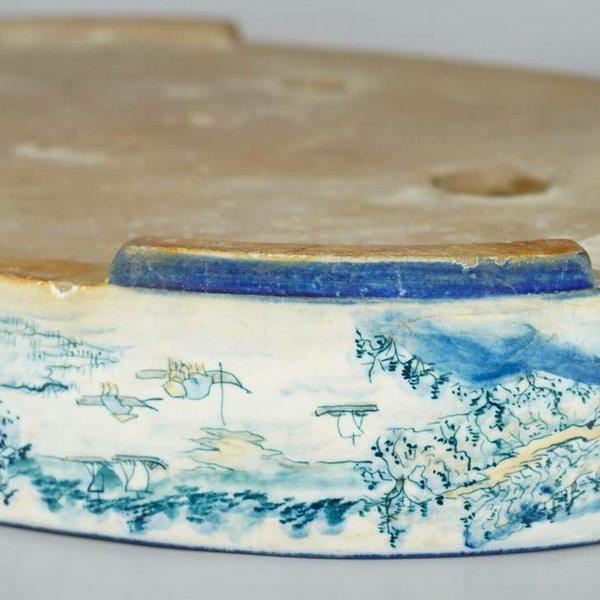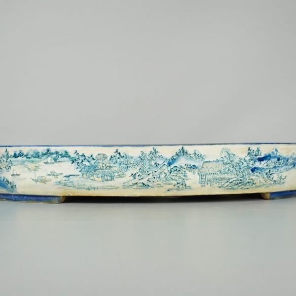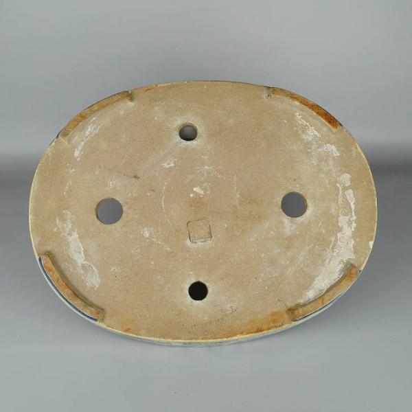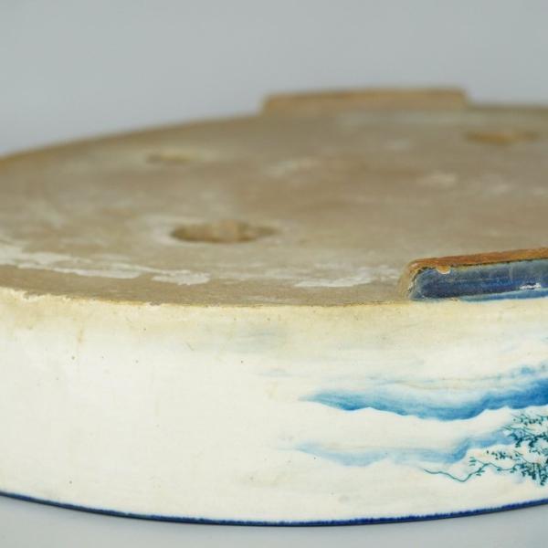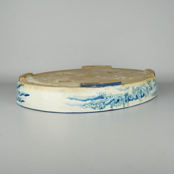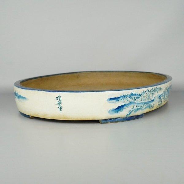 Used Bonsai Pot by Tosuien, Crafted with Tosuifude Brush, Medium Size, Long Side Approx. 38.3cm, Oval Pot, Colored Landscape Design, Actual Condition, Used Pot