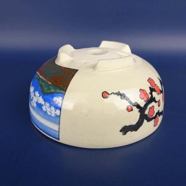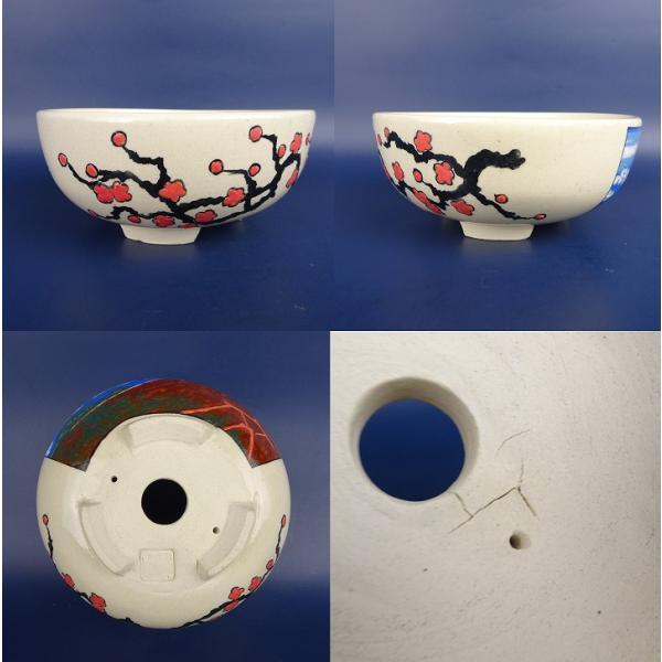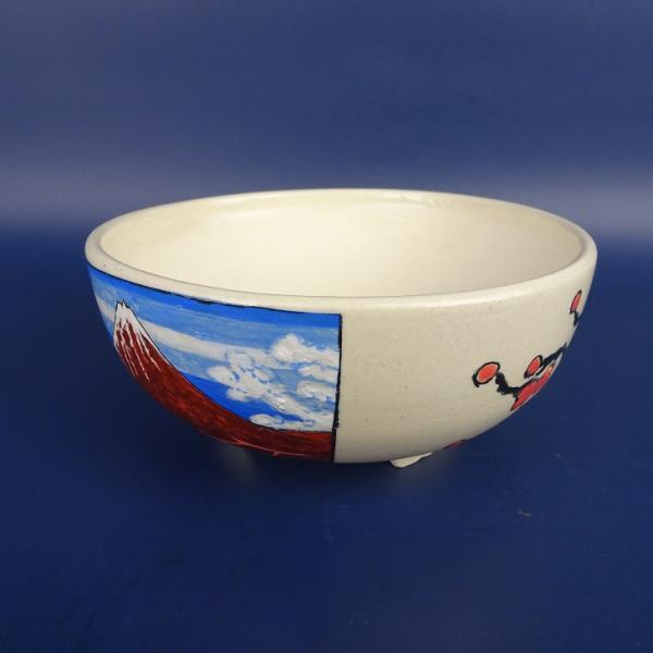 Used Bonsai Pot, Semiyama, Small, Approximately 13cm Long, Round, with a Landscape Painting of Mt. Fuji and Flowers, Pre-owned