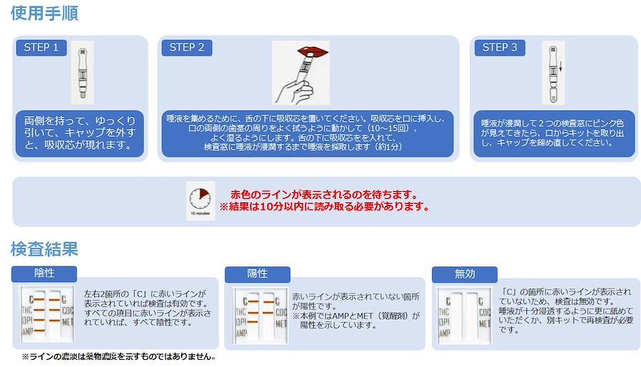 【郵送不要!最短1分!唾液検査は場所を選ばずすぐに結果がわかる】 本商品1つでいつでもどこでも簡単に「覚醒剤(メタンフェタミンとアンフェタミン)、大麻、コカイン、ヘロイン」の5種類の薬物検査をすることができます。検査後も面倒な郵送は不要です。最短1分でその場で結果を確認できるので、緊急時でもすぐに対応することができます。まずはお試ししやすい1個セットです。 【シンプルでわかりやすい唾液検査キット】 ①セットのキャップを外し、吸収芯を出す。 ②吸収芯を口に含み歯茎の周りを拭うように10~15回程動かし唾液を含ませます。 ③唾液が浸潤し、検査窓にピンク色が見えたら口から取り出しキャップを締めなおす。 ④赤いラインが表示されれば、そのラインが表示された記号の薬物について陰性(使っていない)であることがわかります。ラインが全く表示されないときは、その記号の薬物について陽性(使っている可能性がある)であることがわかります。 注1: 唾液採取前、少なくとも10分間は、食物、飲物、ガム、タバコ製品などを口に入れないようにしてください。 注2:ラインの色の濃淡は薬物の濃度とは無関係です。 "【NPO法人アパリが販売しています】 NPO法人アパリの正式名称は、特定非営利活動法人 アジア太平洋地域アディクション研究所です。 私たちアパリは、薬物依存症の人に必要なサポートを提供しています。 既存の医療・司法システムの考え方にとらわれず、国境を越えてアディクション(病的依存症)の予防・回復支援に必要な情報、プログラム、人材の育成、ネットワークの構築を目指しています。" 【詳細情報】 ・検査対象薬物:覚醒剤(MET)、覚醒剤の代謝物(AMP)、大麻(THC)、コカイン(COC)、ヘロイン(OPI) ・内容量:1個 ・保存方法:密封包装のまま2~30℃で保管してください。