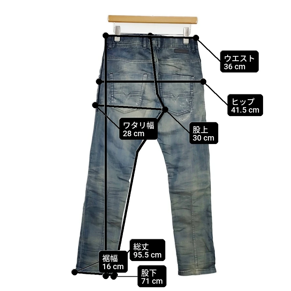 | 実寸サイズ | 総丈:約95.5cm ウエスト:約36cm ウエスト最長:約43cm 股上:約30cm 股下:約71cm ヒップ:約41.5cm ワタリ幅:約28cm 裾幅:約16cm ※採寸画像がある商品はハンガーに吊るした状態での計測のため、平置きでの採寸とは差が生じる場合がございます。平置きでの実寸サイズをご希望の場合は、ご購入前に必ずご質問ください。 ※記載以外のサイズが合わないことを理由とした返品はできませんので、 記載部分以外で実寸サイズの気になる箇所があれば必ず購入前にご質問ください。 |
