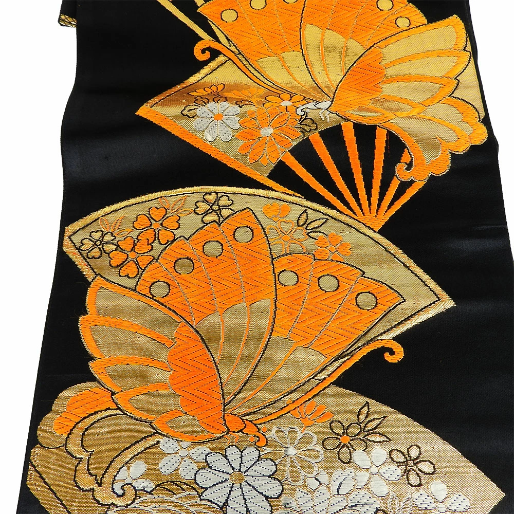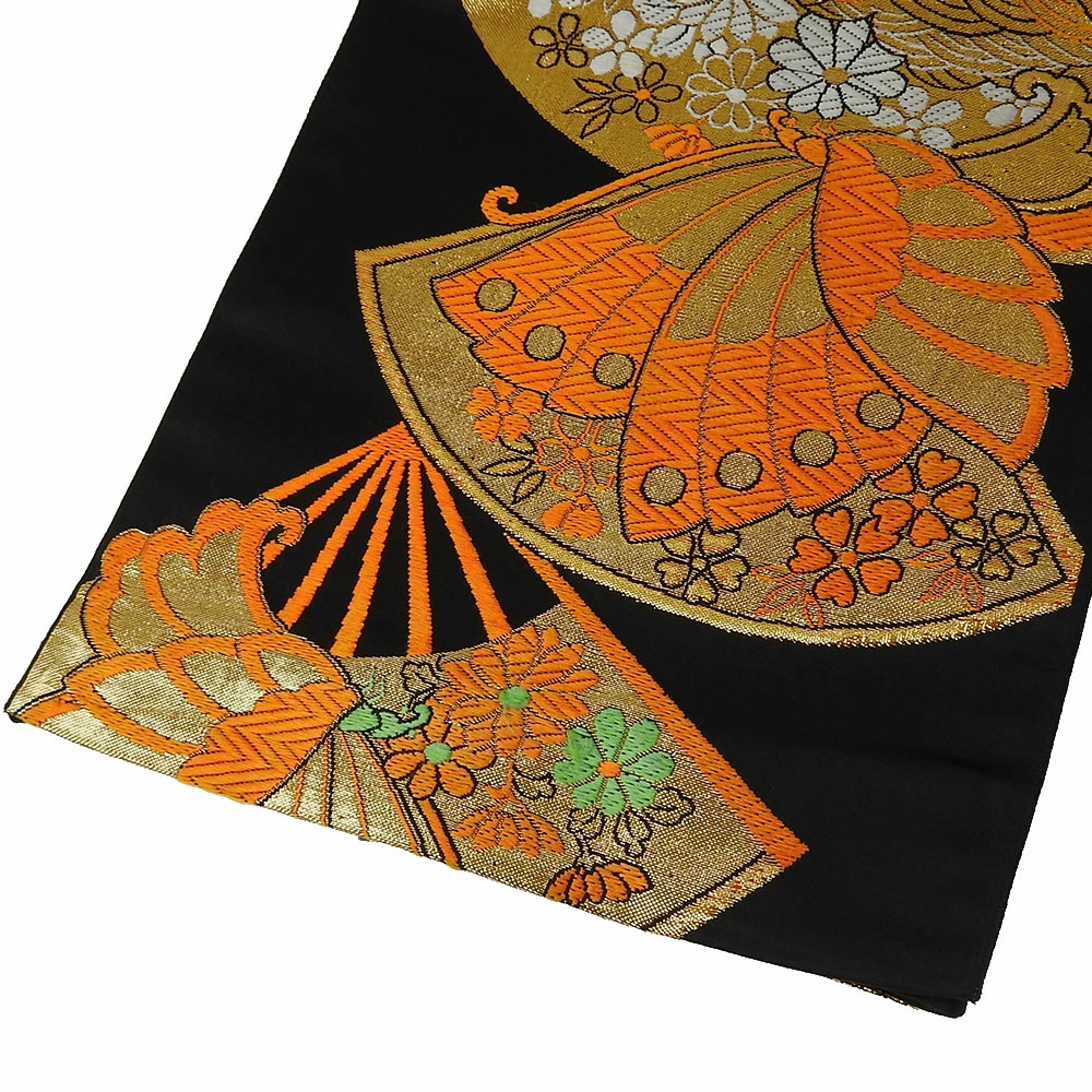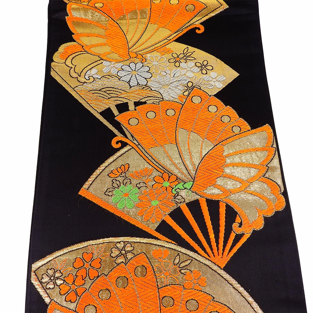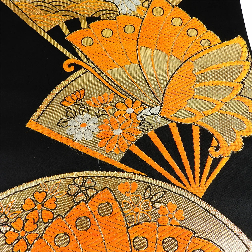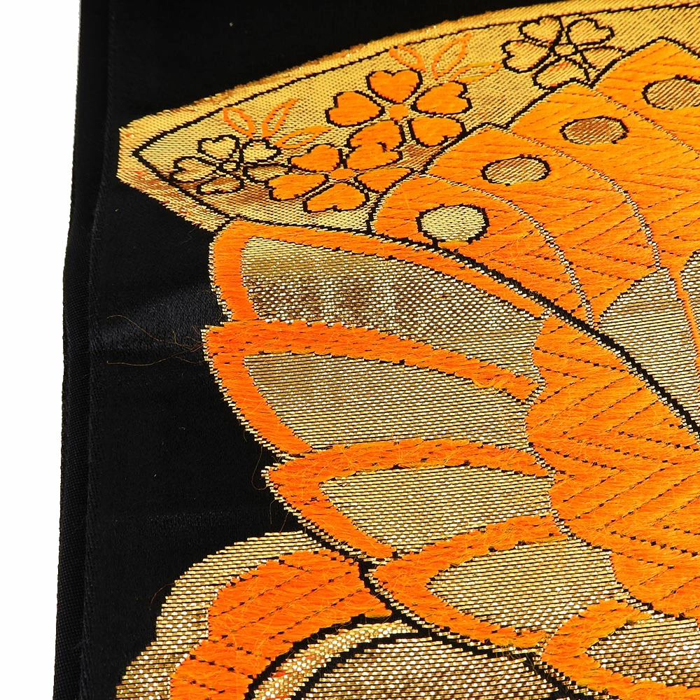 | 品名 | 【中古】 袋帯 正絹(金銀糸除く) ブラック オレンジ 七五三用 扇面柄 蝶 |