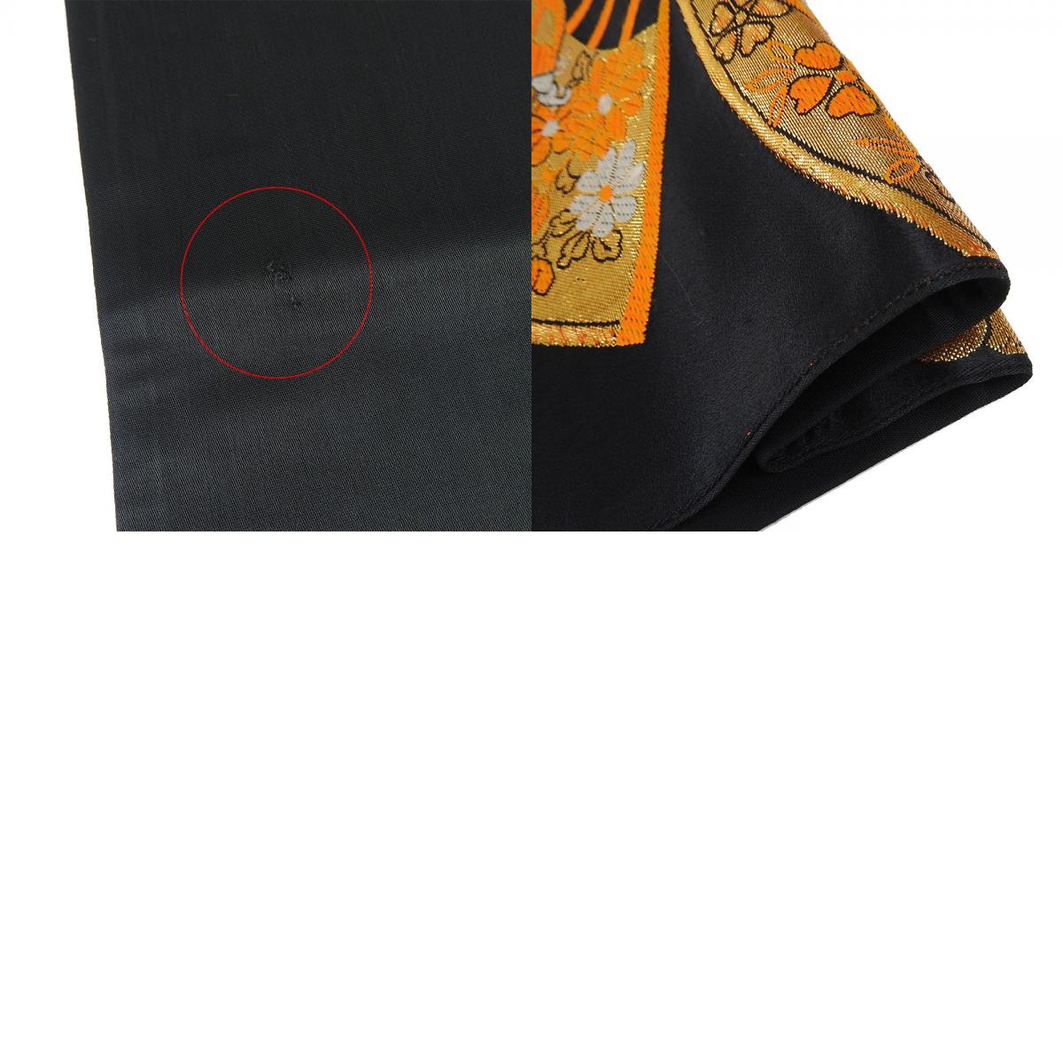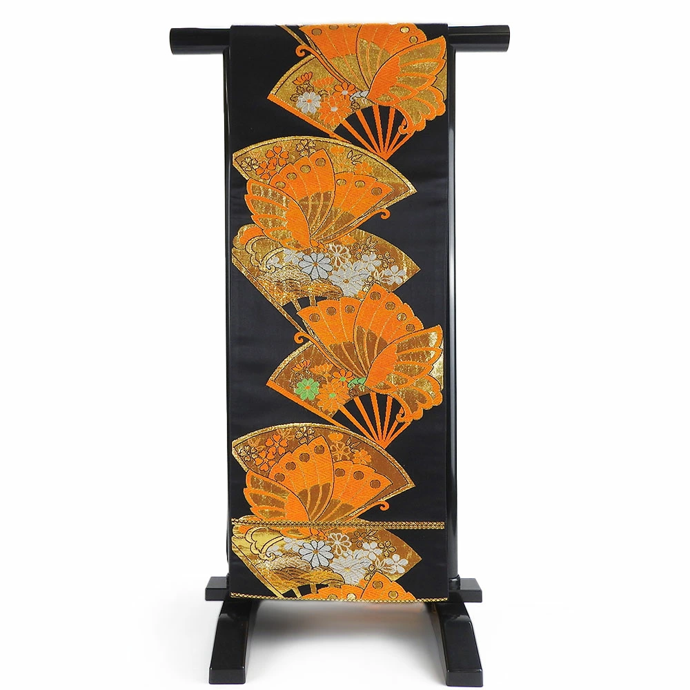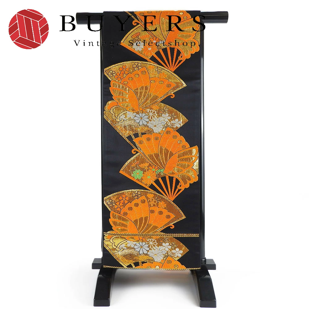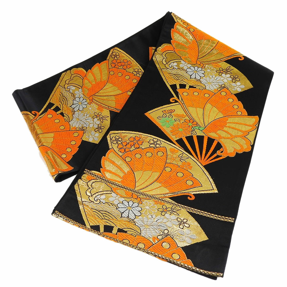 | 品名 | 【中古】 袋帯 正絹(金銀糸除く) ブラック オレンジ 七五三用 扇面柄 蝶 |