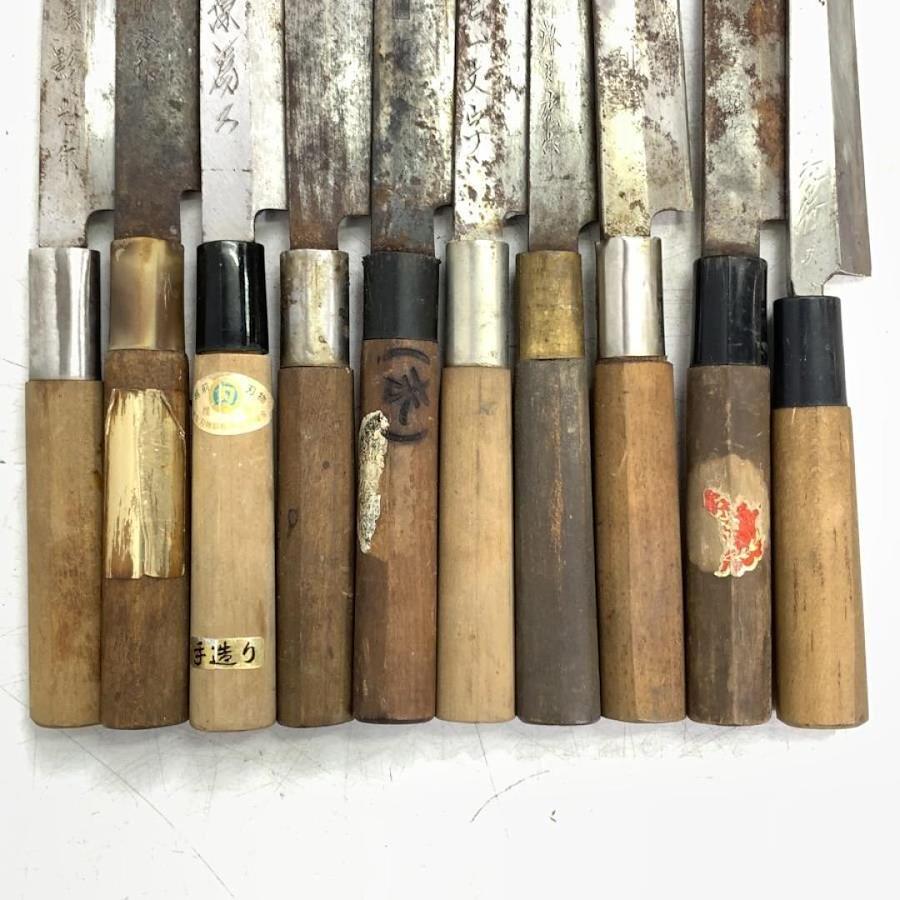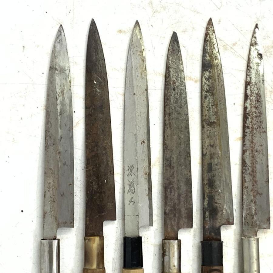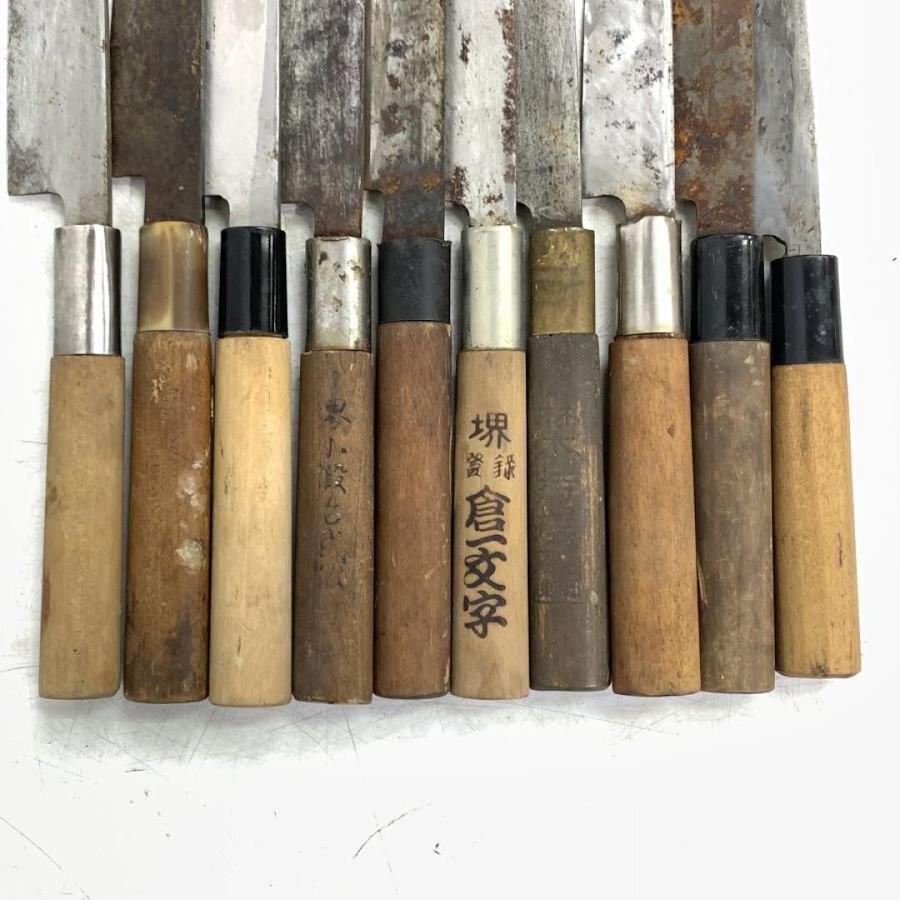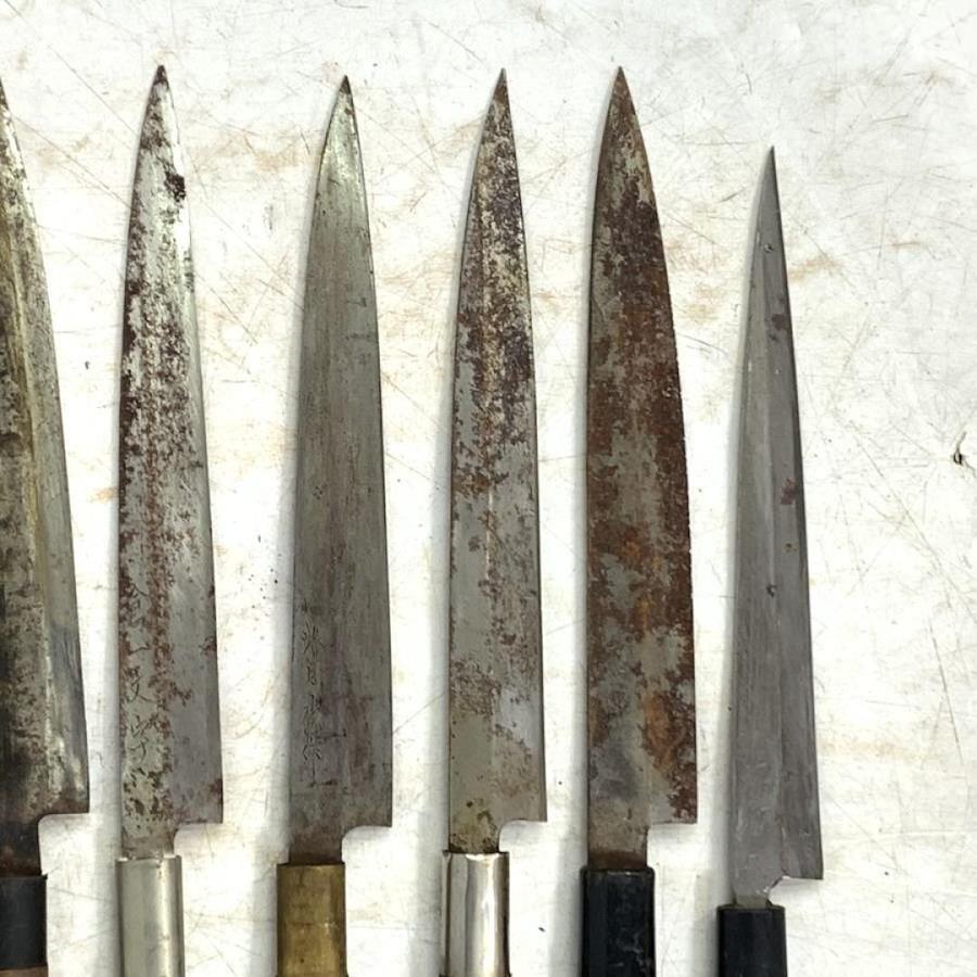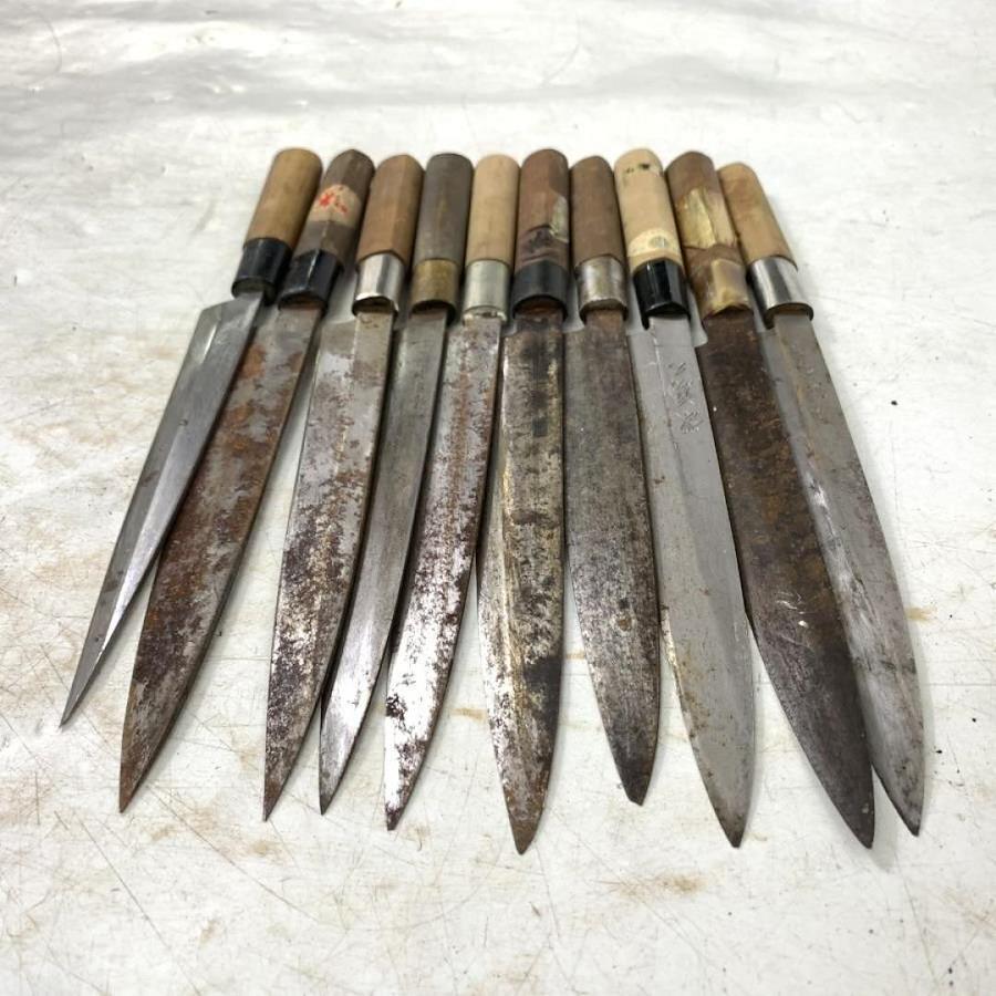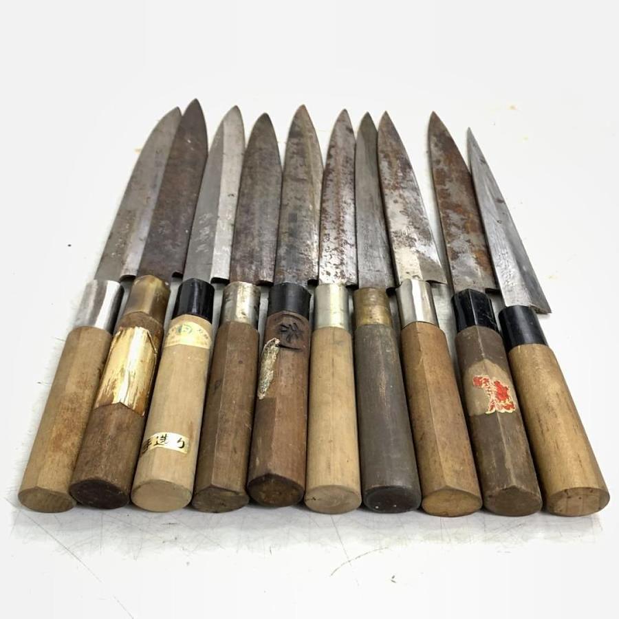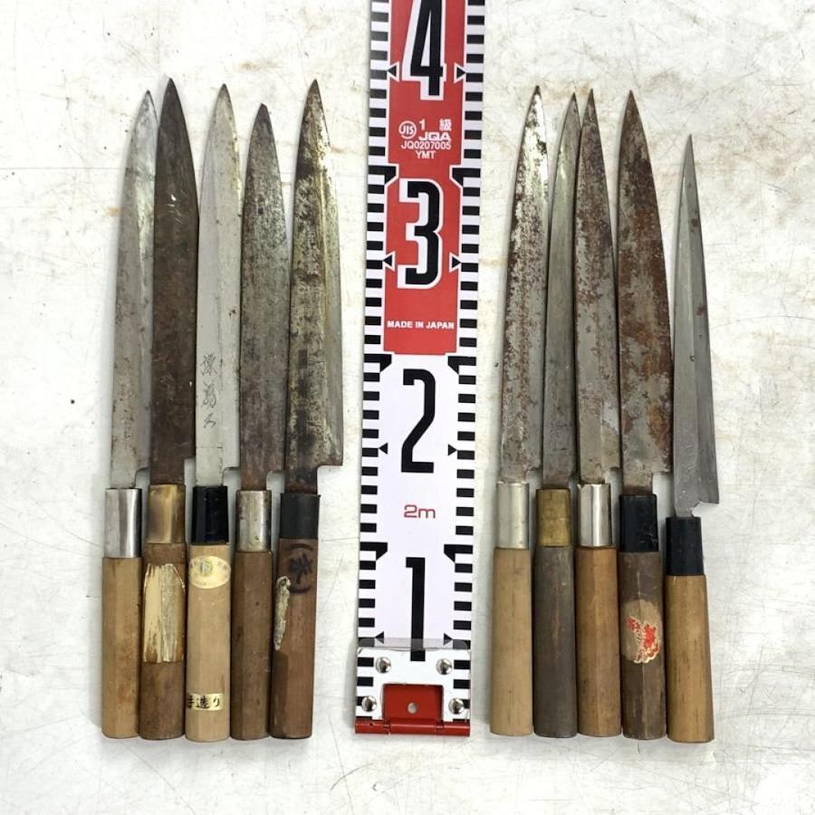 **Key Features & Condition:*** **Quantity:** 10 Knives (Set of Ten)* **Type:** Traditional Japanese style (Sashimi, Yanagiba, Deba, etc. - mixed lot)* **Condition:** **Used**. Blades show **heavy rust, corrosion, and wear**. Handles are dirty and aged. Sold **AS-IS**. Please review all photos carefully for current condition.* **Era:** Vintage / Unknown. Handles feature various maker marks (e.g., Shosho, Kage Hikari, Minamoto Tamehisa, Sakai Takayuki). Markings are often illegible due to rust/wear, please see photos.
