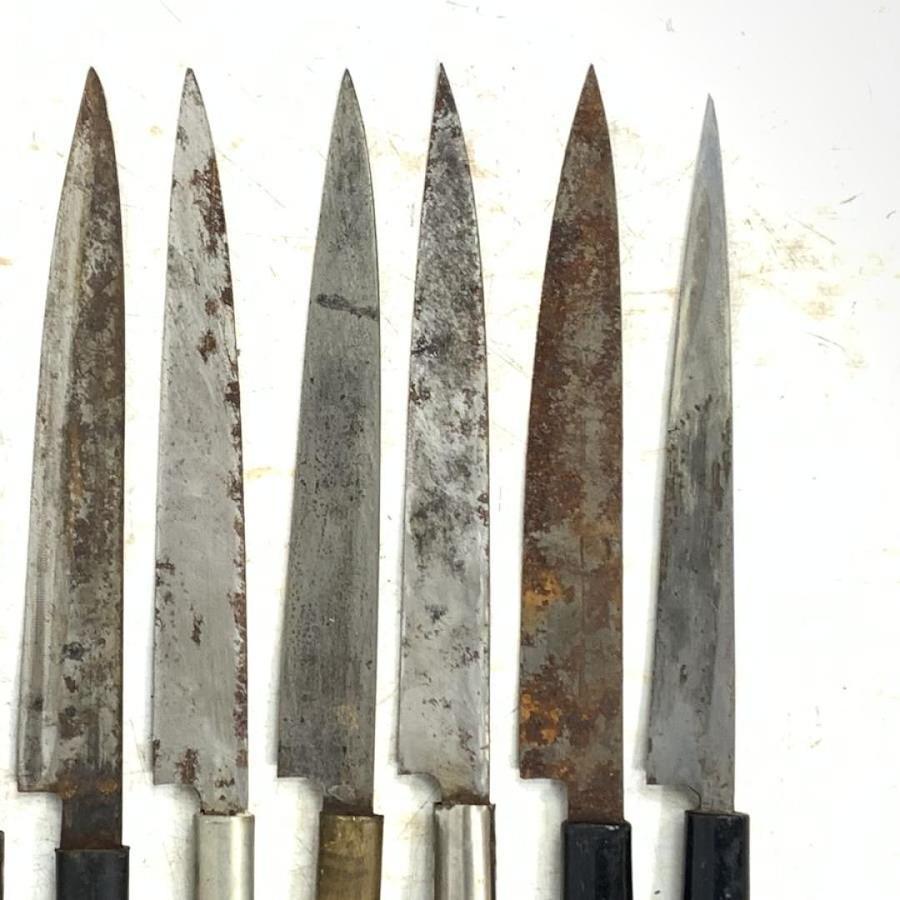 This listing is for a set of 10 traditional Japanese kitchen knives (Wa-Bocho), including various types such as Sashimi (Yanagiba) knives. This set is considered **JUNK/FOR PARTS OR REPAIR** due to heavy rust, corrosion, and wear on the blades.