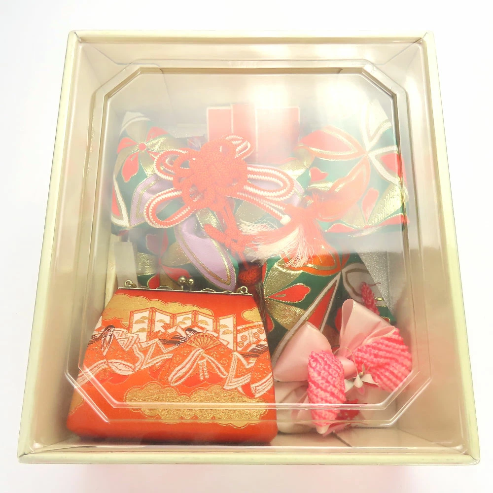 | 仕様 | 詳細備考:結び部分 縦:最長約28cm 横:最大約30cm 半えり 全長:約80cm 箱迫 縦:約6.5cm 横:約10cm 扇子(閉じた状態) 長さ:約16cm 髪飾り(大) 縦:約13cm 横:約13cm 和装バッグ 縦:約13cm 横:約15.5cm 幅:約5cm | 付属品 | 保存箱 / 結び帯 /和装バッグ /箱迫 /寿扇子(未使用品) /かんざし /かんざし入れ /髪飾り×2 /半えり(未使用品) /御守り |