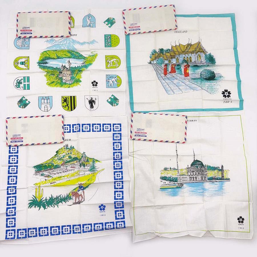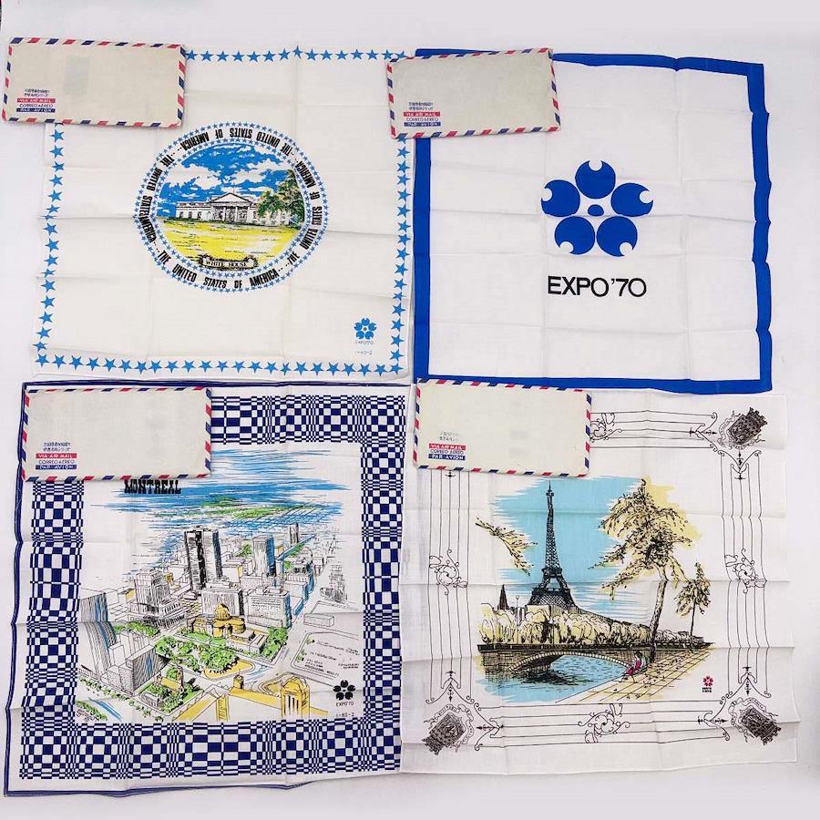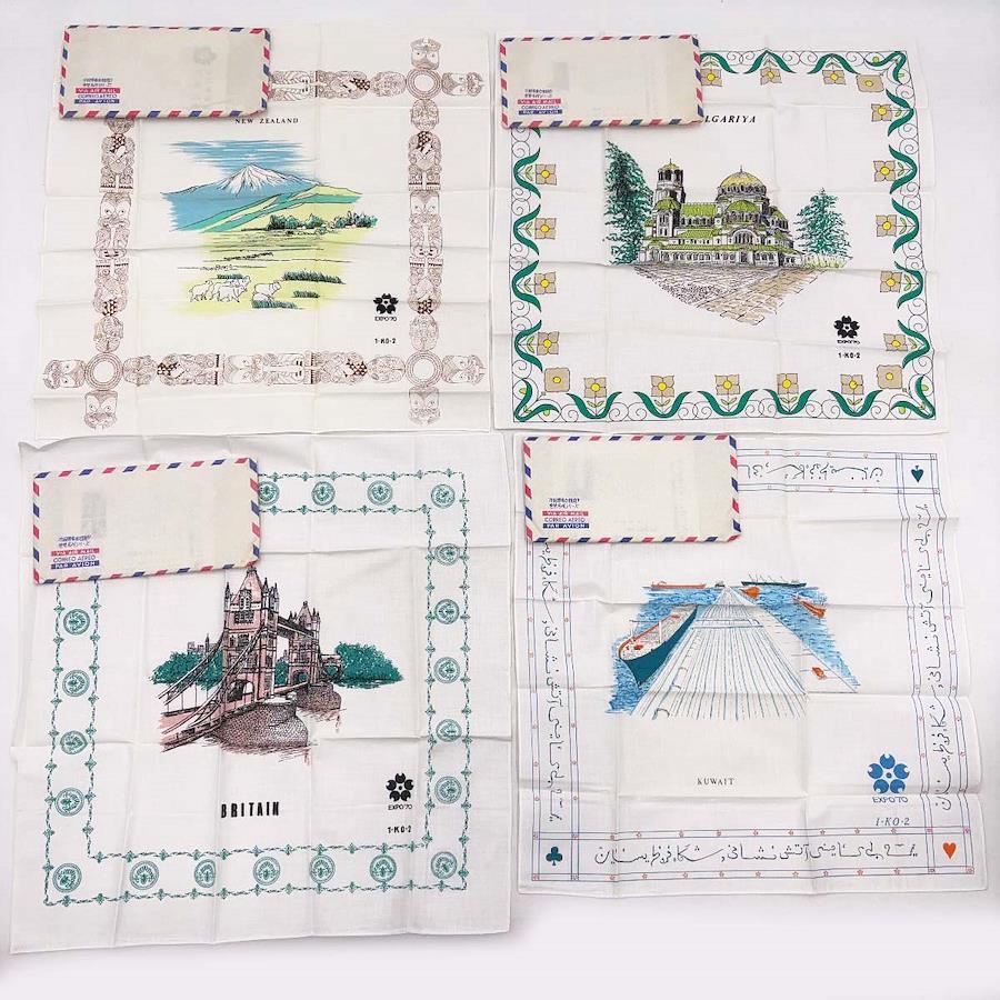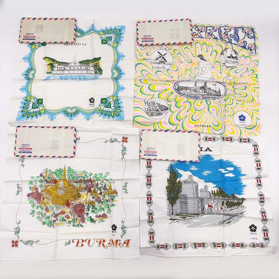 [タイプ] EXPO'70 ハンカチ 万国博参加国巡り 世界名所シリーズ 35カ国 + シンボルマーク柄 + マジックハンカチ[状態] 未使用保管品。古いものになるためハンカチが入っている紙の袋(封筒)には汚れ(ヤケ)がついていますが、ハンカチ自体は良好です。(ただしごく一部、袋の汚れがハンカチに移ってしまっているものがあります。)