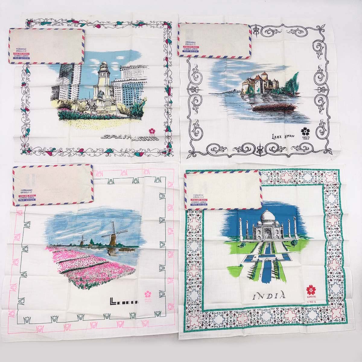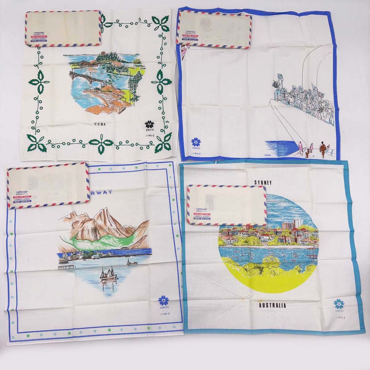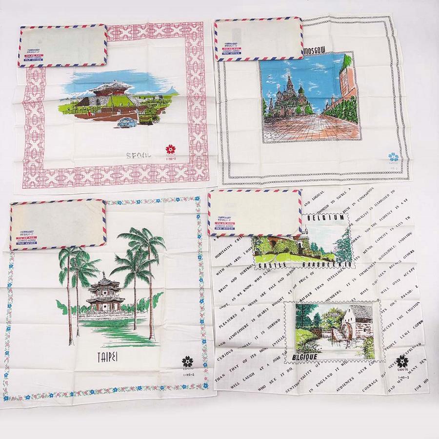 [タイプ] EXPO'70 ハンカチ 万国博参加国巡り 世界名所シリーズ 35カ国 + シンボルマーク柄 + マジックハンカチ[状態] 未使用保管品。古いものになるためハンカチが入っている紙の袋(封筒)には汚れ(ヤケ)がついていますが、ハンカチ自体は良好です。(ただしごく一部、袋の汚れがハンカチに移ってしまっているものがあります。)