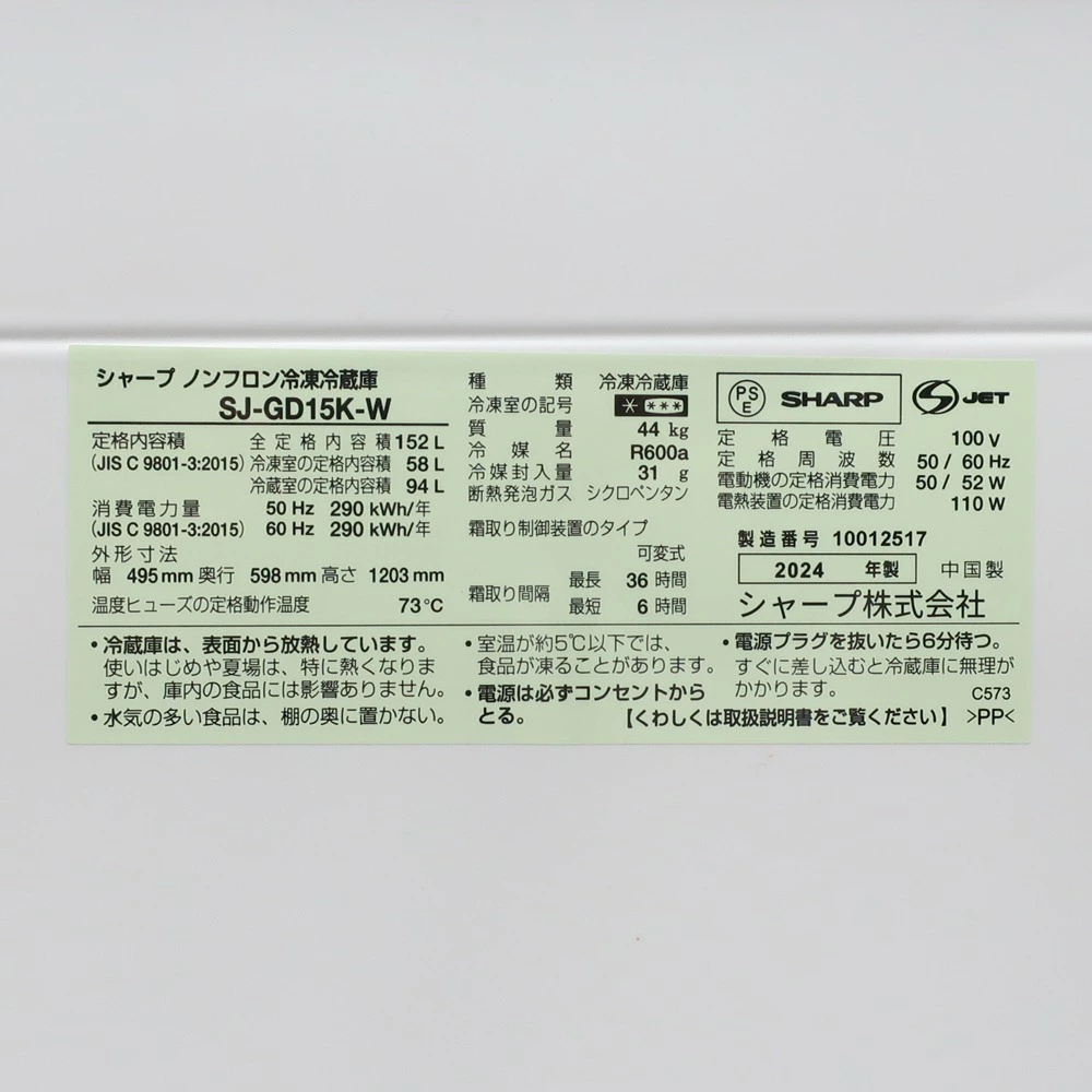 | モデル名 | 2ドア冷蔵庫 152L 2024年製 |