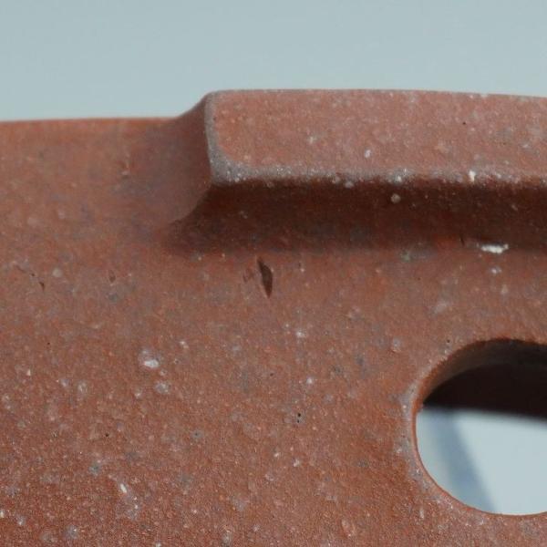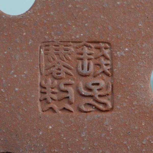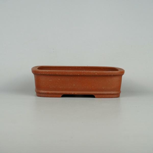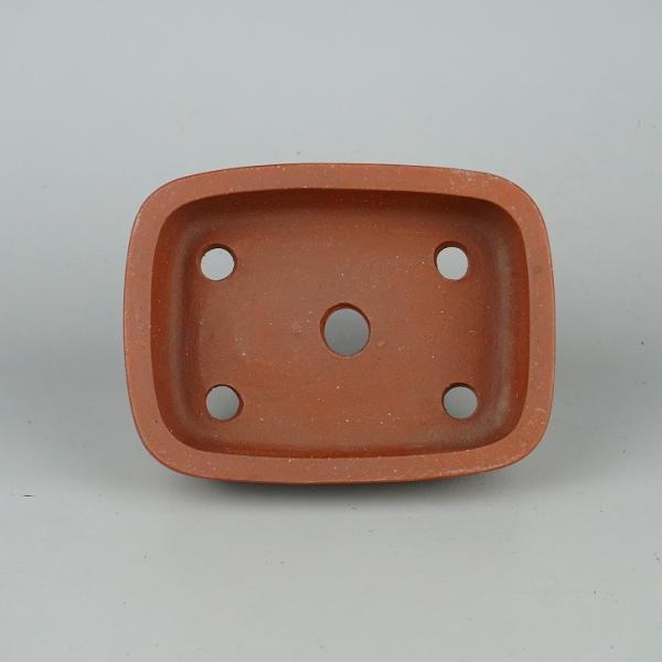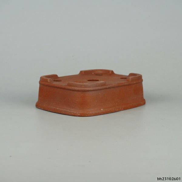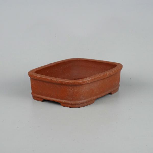 Used Tokoname Zengo bonsai pot, small, approximately 15.3cm long, rectangular, with a curved outer edge and a muddy underbelly. Used pot.